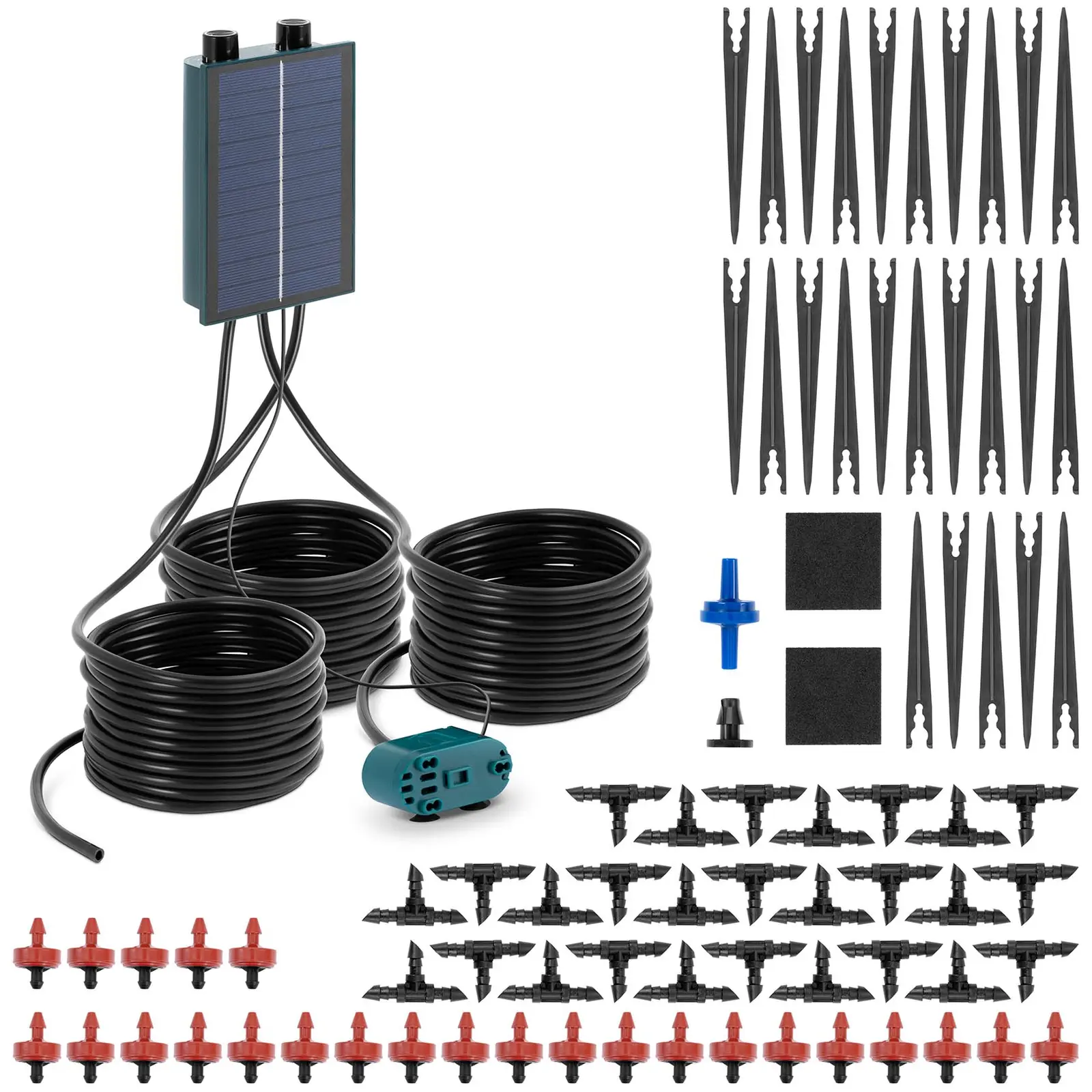 Gropitorii care aduc apa la plantă sunt introduși în furtunul lung de 10 m cu ajutorul unor piese în T. Datorită picurătoarelor {{Număr_de_secțiuni}}, puteți alimenta până la 50 de plante cu sistemul de irigare. Atașați picurătoarele la sol cu ajutorul unor cârlige mici. Ghidați pompa în rezervorul de apă, care alimentează apa în furtun. Utilizați unitatea de comandă pentru a selecta timpul de udare: 1 sau 5 min/24 h.; 2 sau 8 min/48 h.; 3 sau 12 min/72 h.. Odată ce panoul solar a încărcat bateria, irigarea se realizează în mod complet automat în funcție de ora selectată.