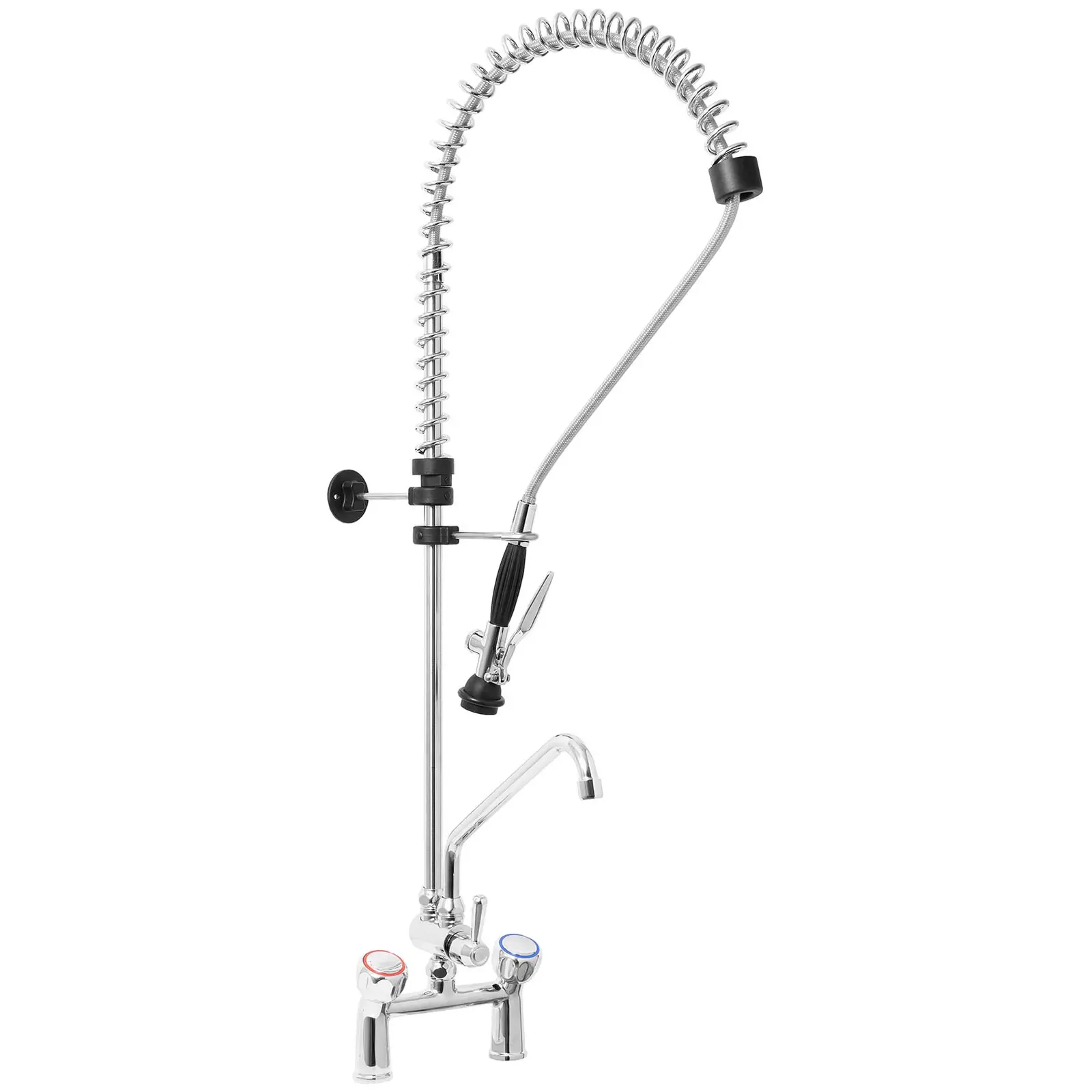 Cu un robinet 250 de mm foarte lung și un furtun 1000 de mm, robinetul de clătire prealabilă cu două orificii oferă un mare confort la clătire. Fie că este vorba de gospodării private sau de restaurante, școli și multe alte domenii de aplicare: combinația de mânere pentru hota, pulverizator flexibil și robinet înalt și pivotant facilitează munca și asigură rezultate igienice.