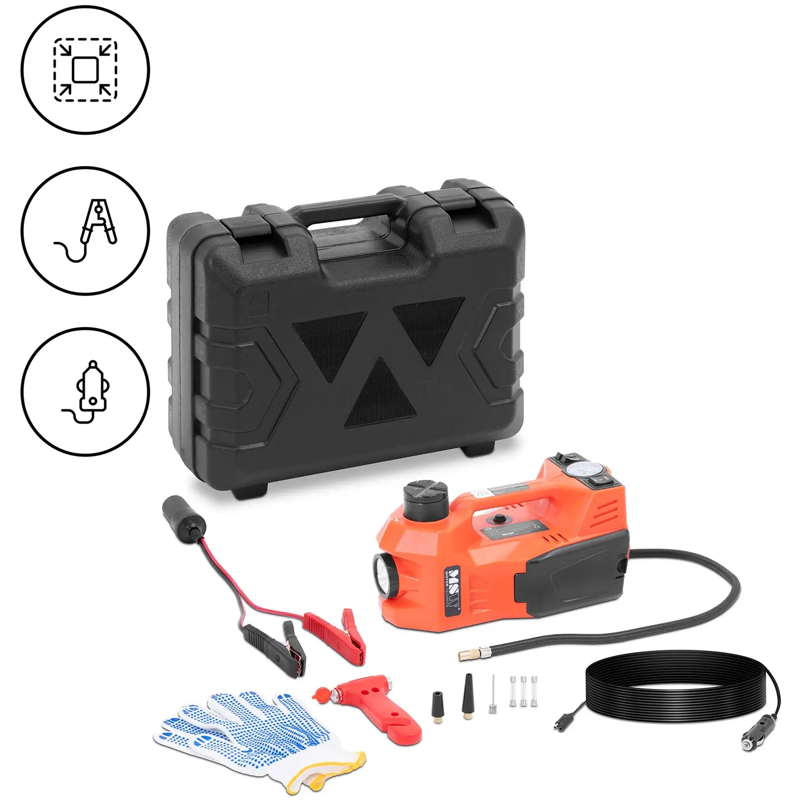 O pană de cauciuc în mijlocul drumului. Și acum? Țineți la îndemână cricul electric pentru mașini de la MSW. Setul all-in-one include toate uneltele de care aveți nevoie pentru a înlocui și repara anvelopele în caz de urgență: cric, compresor de aer, ciocan de siguranță, mănuși și alte accesorii. Fie că vă aflați într-o parcare sau pe marginea drumului, ridicați, umflați și reparați anvelopele fără efort cu acest instrument versatil. Geanta practică de transport și designul compact al cricului auto fac din acest set ideal pentru oricine dorește să își întrețină vehiculul, să ofere asistență rutieră sau să opereze un serviciu mobil de reparații.