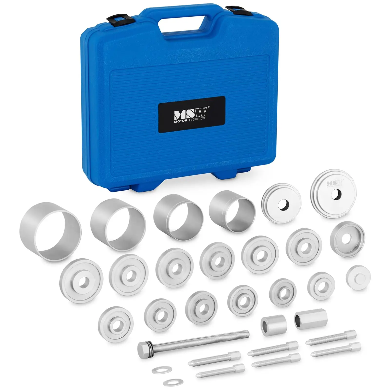 Kit de extragere a rulmenților de roți - 28 buc.Trusă Montat/Demontat Rulmenţi Roată - VW T5, 85 mmSeparator de articulații sferice - 9 buc.Kit de extragere a rulmenților de roți - Ø 62 mm, 66 mm, 72 mmKit de manșoane de presare și tragere pentru rulmenți de roți și bucșe de suspensie
