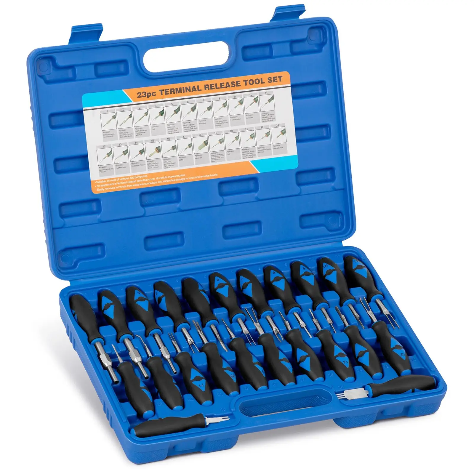 Setul de unelte de scoatere a pinilor, cu cele 23 de piese, se potrivește la aproape toate fișele vehiculelor. Glisați unealta de deblocare corespunzătoare pe vârful de deblocare al știftului. Unealta comprimă barboanele de pe manșonul știftului și slăbește strângerea strânsă.