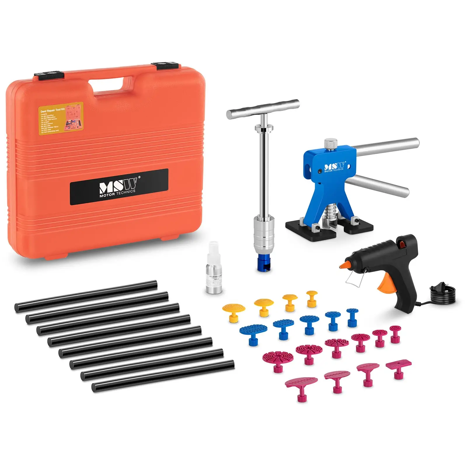 Fie că doriți să scoateți lovituri mici cu un dispozitiv de îndepărtare a loviturilor, fie că doriți să scoateți daune mai mari cu un ciocan de alunecare, acest kit are unealta potrivită pentru fiecare lovitură. Setul conține un total de 33 de piese, toate fiind perfect adaptate pentru a scoate loviturile fără a deteriora vopseaua. Un pistol puternic de lipit cu clei cald este inclus pentru fixarea diferitelor adaptoare de tragere.