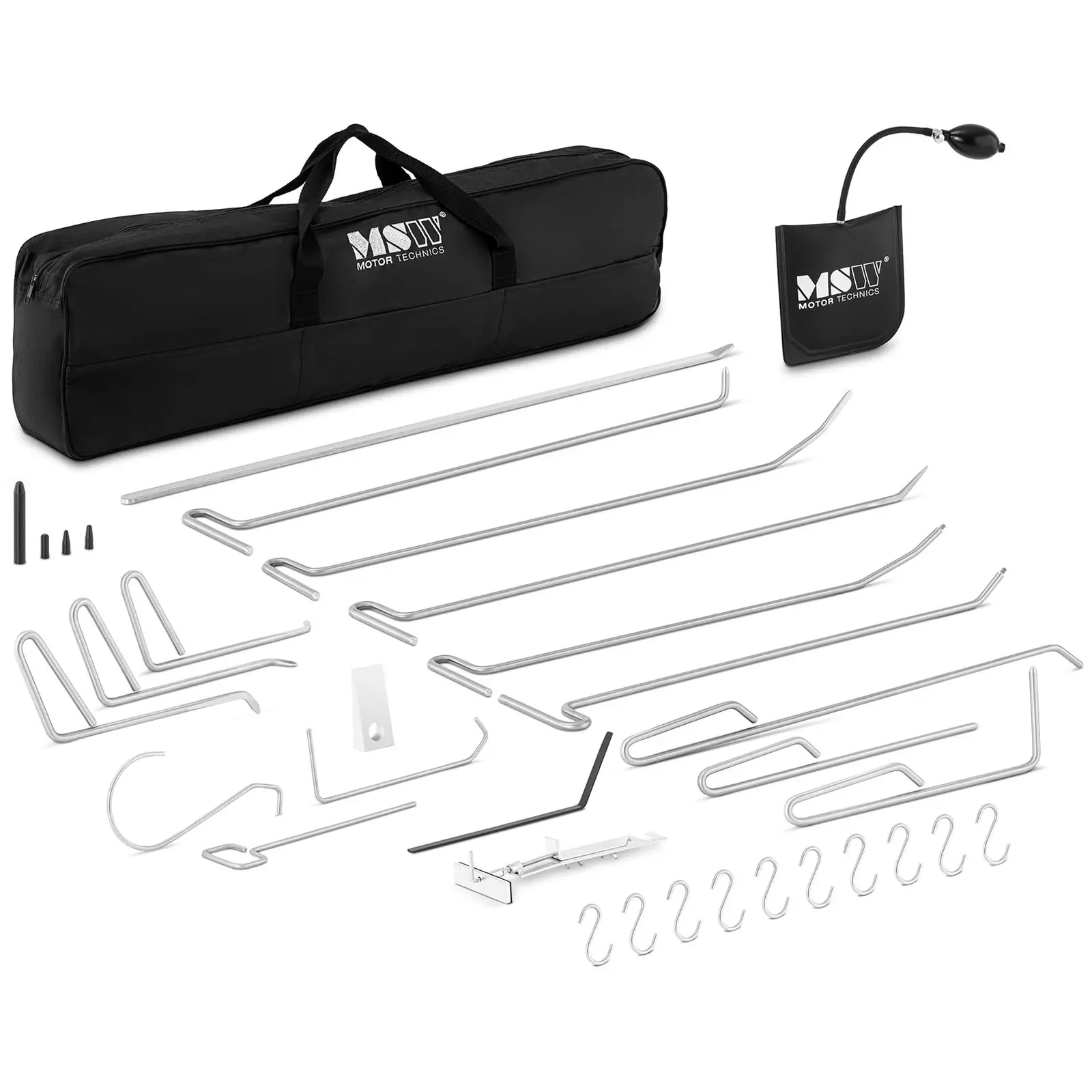 Atunci când cumpărați acest set, primiți 15 dispozitive de ridicare a danturii, precum și o pernă de montare și o pană, cârlige și alte accesorii, precum și o geantă de transport practică. Cu ajutorul pârghiilor de dimensiuni și capete diferite, puteți aborda cu precizie lovituri de forme diferite. Extractorul de lovituri vă permite să reparați în mod profesionist lovituri mici, cum ar fi cele provocate de grindină, fără a fi nevoie să efectuați ulterior lucrări de vopsire ample. Mai ales dacă stratul de vopsea nu are defecte, acest set de instrumente de îndepărtare a loviturilor delicate este alegerea ideală pentru curățarea eficientă și economică a daunelor minore ale caroseriei.