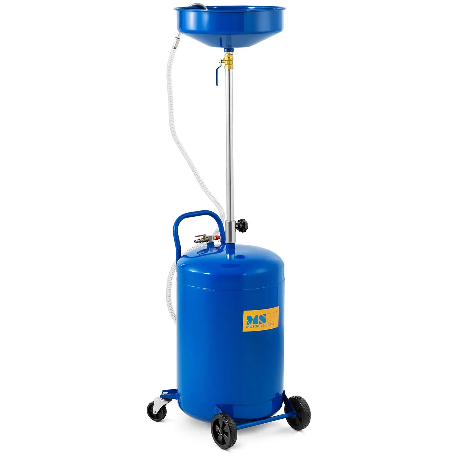 Datorită construcției sale din materiale robuste (Oțel, PVC) și a celor patru roți, dispozitivul de scurgere a uleiului uzat este extrem de stabil și durabil. Două roți sunt statice, două sunt flexibile. În acest fel, căruciorul de colectare a uleiului poate fi manevrat prin atelier fără probleme. Diametrul rolelor este de 2x5" și 2x3".