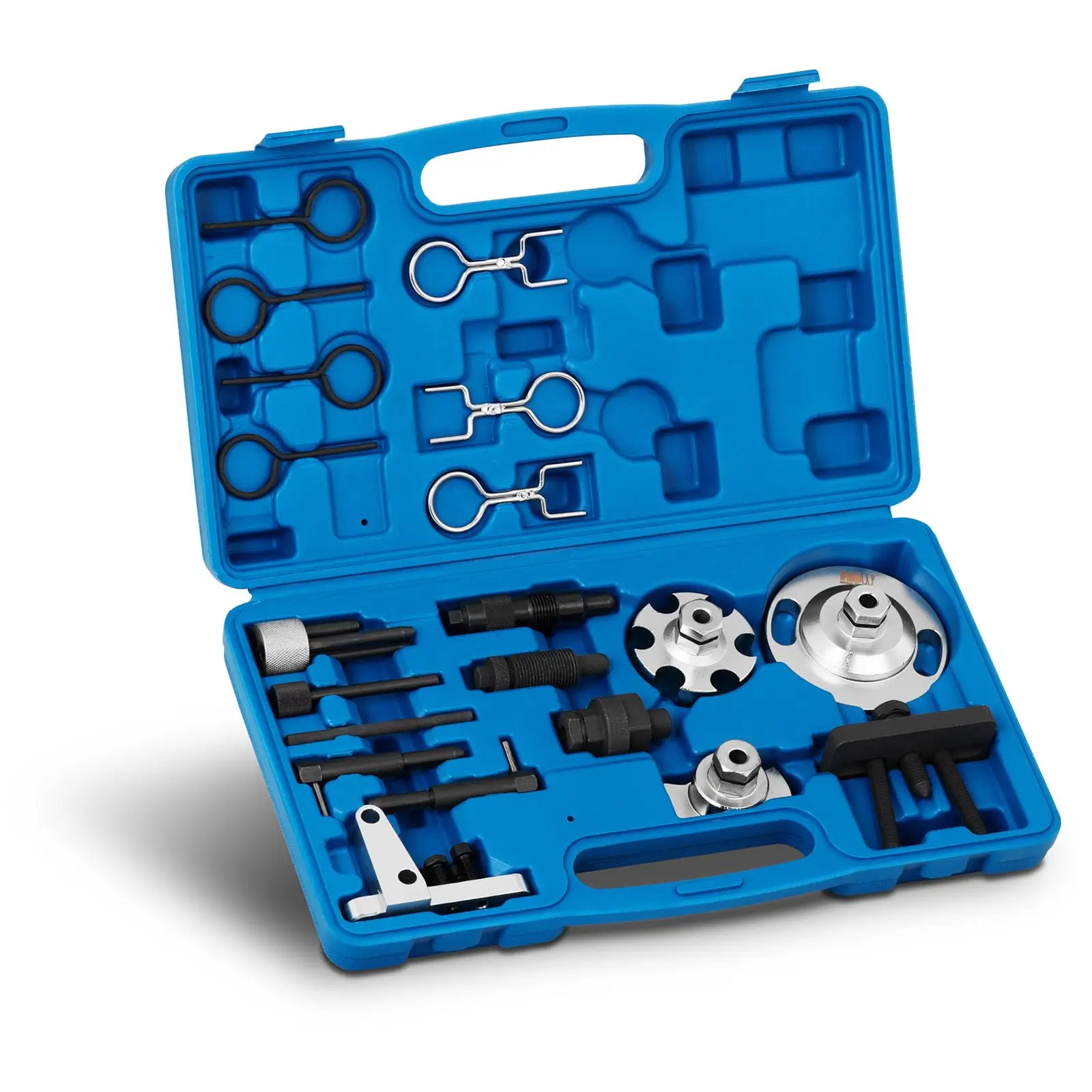 Uneltele de înaltă calitate incluse în livrare includ adaptoare pentru pinioane, arborele cotit și arborele cu came, diverse știfturi de blocare, dispozitive de fixare, dispozitive de tragere și multe alte unelte. Uneltele fabricate din oțel carbon rezistent și durabil vă vor oferi mulți ani de servicii fidele și, prin urmare, nu ar trebui să lipsească din nici un atelier auto profesionist sau din garajul unui mecanic de hobby ambițios!