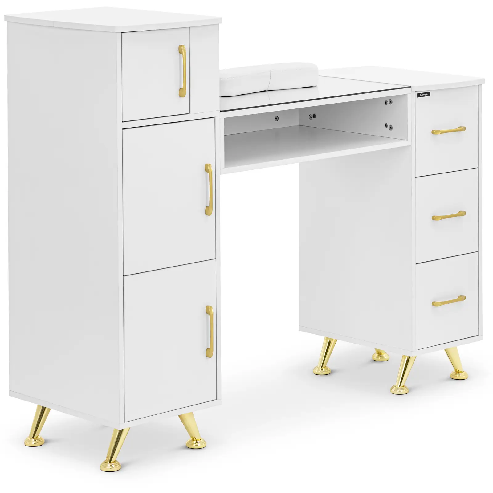 Masă Nail - blat de sticlă - alb / auriu - 3 sertare - suport pentru mâiniStație de manichiură - 1.200 x 503 x 803 mm - White} - pe 8 roți - cu sistem de aspirare a prafului și suport pentru mâiniBirou pentru unghii - 3 sertare - Extracție