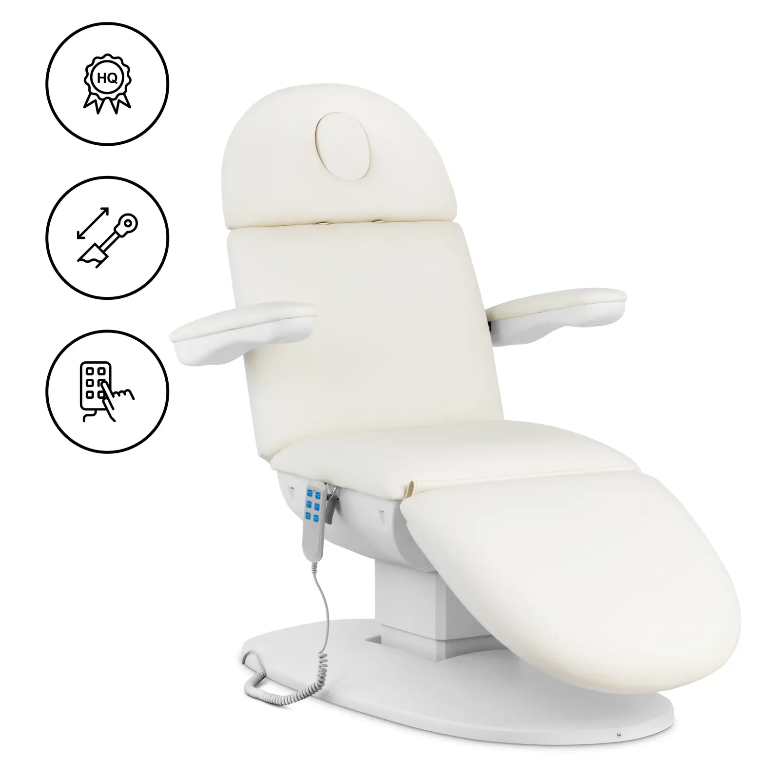 Proiectat ergonomic de jos în sus, patul de înfrumusețare este echipat cu o varietate de funcții pentru a maximiza confortul dumneavoastră și al clientului dumneavoastră. Un motor puternic permite o reglare ușoară prin intermediul telecomenzii cu fir. Setați înălțimea într-un interval de 560 - 760 mm. În plus, puteți regla unghiurile spătarului (0 - 90°), ale cotierelor (0-180°) și ale suportului pentru picioare (0 - 45°) pentru a se adapta la tratament și la client.