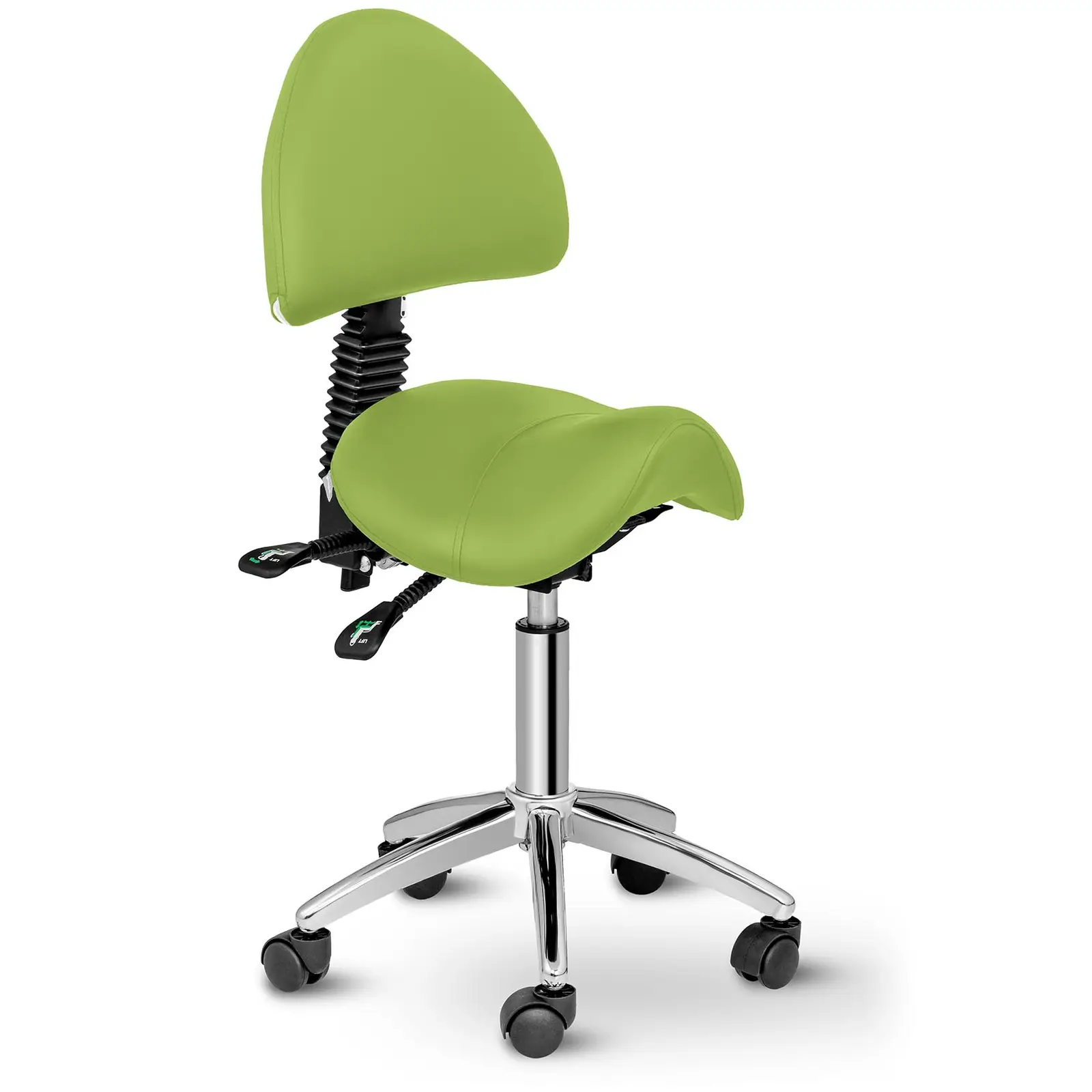 Acest scaun confortabil cu suport pentru spate PHYSA BERLIN LIGHT GREEN de la Physa are un sezut in forma de sa, asa cum sugereaza numele. Echipat cu roti pivotante cu rulare lină și opțiuni multiple de reglare, acest scaun se potrivește perfect în orice salon de înfrumusețare sau de coafură, mai ales atunci când munca necesită înălțime și înclinație reglabile, confort și stabilitate. De asemenea, oferă o mobilitate ridicată în spații înguste, este realizată la standarde înalte de fabricație și are o capacitate de încărcare de până la 150 de kilograme. Acest scaun este deosebit de neprețuit deoarece poate fi folosit în atât de multe locuri, inclusiv în saloane de tatuaje, spa, studiouri de wellness, acasă sau la birou.