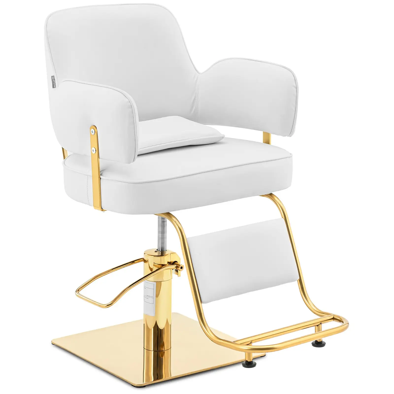 Cadrul scaunului de coafor este fabricat din oțel inoxidabil robust și elegant. Construcția robustă suportă în siguranță o sarcină de 200 kg și conferă scaunului suport și o durabilitate deosebită. Baza mare 45 x 45 cm asigură o stabilitate suplimentară. Suprafețele din oțel inoxidabil placat cu aur subliniază designul elegant.