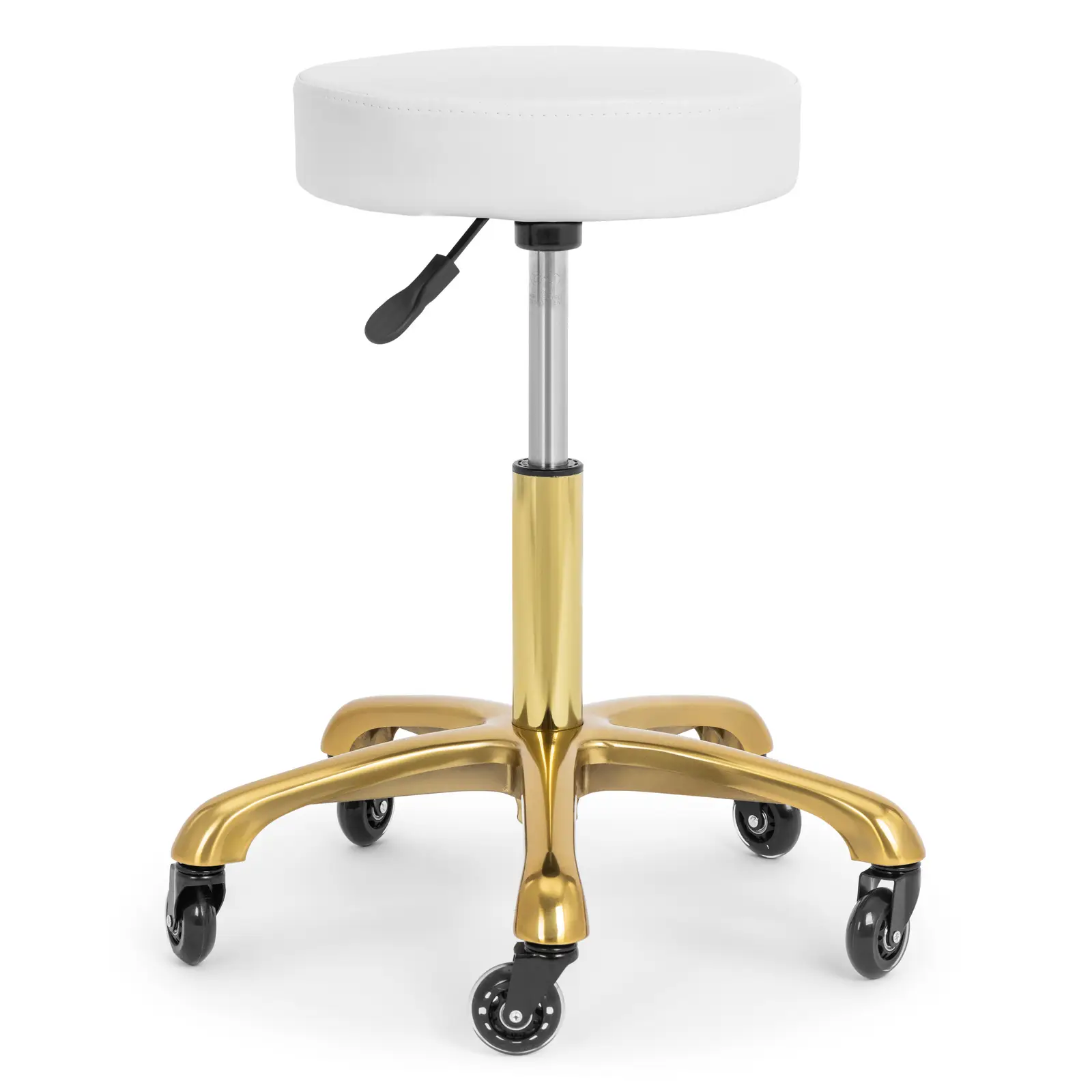 Puteți regla înălțimea scaunului de la 53 - 71 cm pentru a vă proteja spatele și pentru a vă adapta poziția de ședere la sarcina pe care o aveți de îndeplinit. Există un mâner ușor de utilizat pe scaun care vă permite să reglați fără efort înălțimea scaunului prin intermediul pompei pneumatice. În plus, arcul cu gaz asigură o poziție de ședere remarcabil de confortabilă și amortizată. Toate materialele componente se curăță rapid și temeinic. Cu o husă din PVC rezistentă la praf și apă, scaunul rămâne mai curat în timpul lucrului. În ciuda designului său compact și elegant, scaunul de salon este foarte robust și rezistă fără efort la sarcini de până la 150 kg. Cu scaunul său alb și cadrul auriu, taburetul rulant emană un rafinament modern care se potrivește fără efort în orice decor.