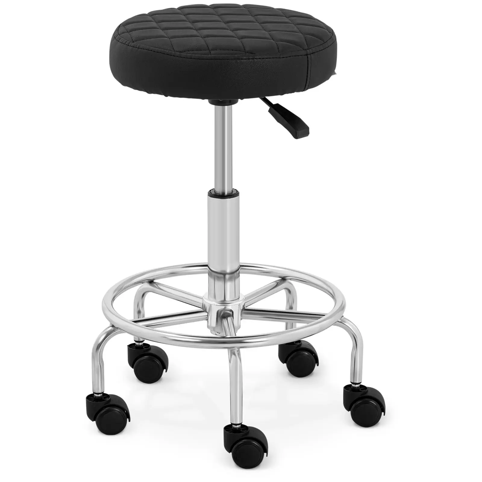 Învelișul din imitație de piele al scaunului de birou este rezistent la lichide și praf, ceea ce îl face foarte rezistent și ușor de curățat. Combinația dintre oțelul cromat și capacul negru conferă taburetului rulant un aspect elegant și atractiv. Scaunul de lucru poate fi dirijat confortabil cu ajutorul picioarelor și poate fi deplasat fără a folosi mâinile. Acest lucru lasă ambele mâini libere pentru a face masaje sau alte tratamente.