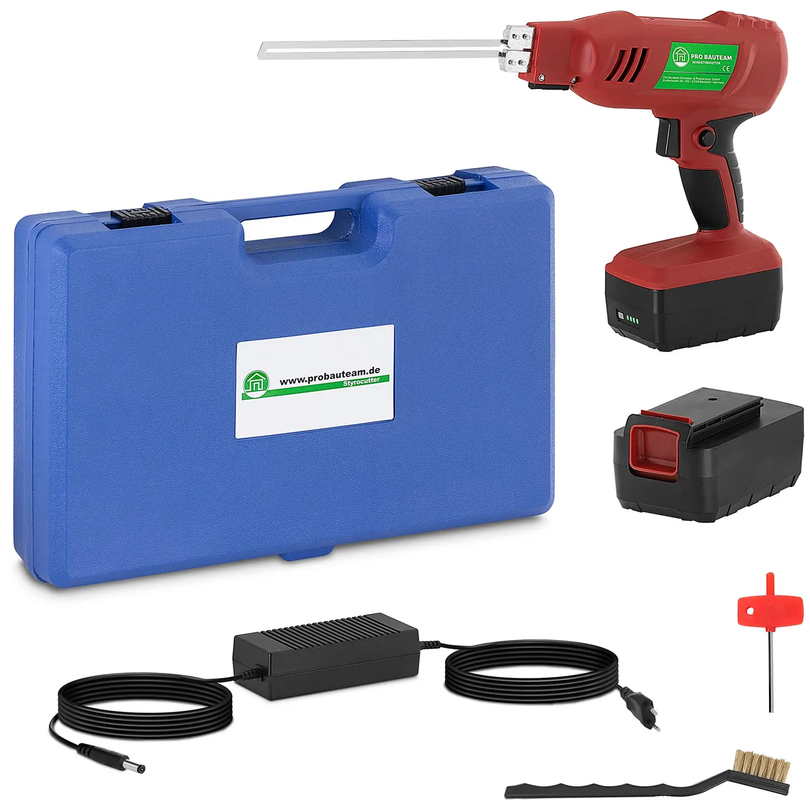 În plus față de dispozitivul de tăiere a spumei STYRO CUTTER PBT05, primiți și o gamă extinsă de accesorii: o lamă dreaptă (200 mm), două baterii litiu-ion, un încărcător, o perie de oțel pentru curățarea lamei și o cheie Allen pentru schimbarea rapidă a lamei. O bandă de măsurare și un marker facilitează o operațiune perfectă. Toate componentele pot fi depozitate în carcasa robustă și pot fi transportate cu ușurință.