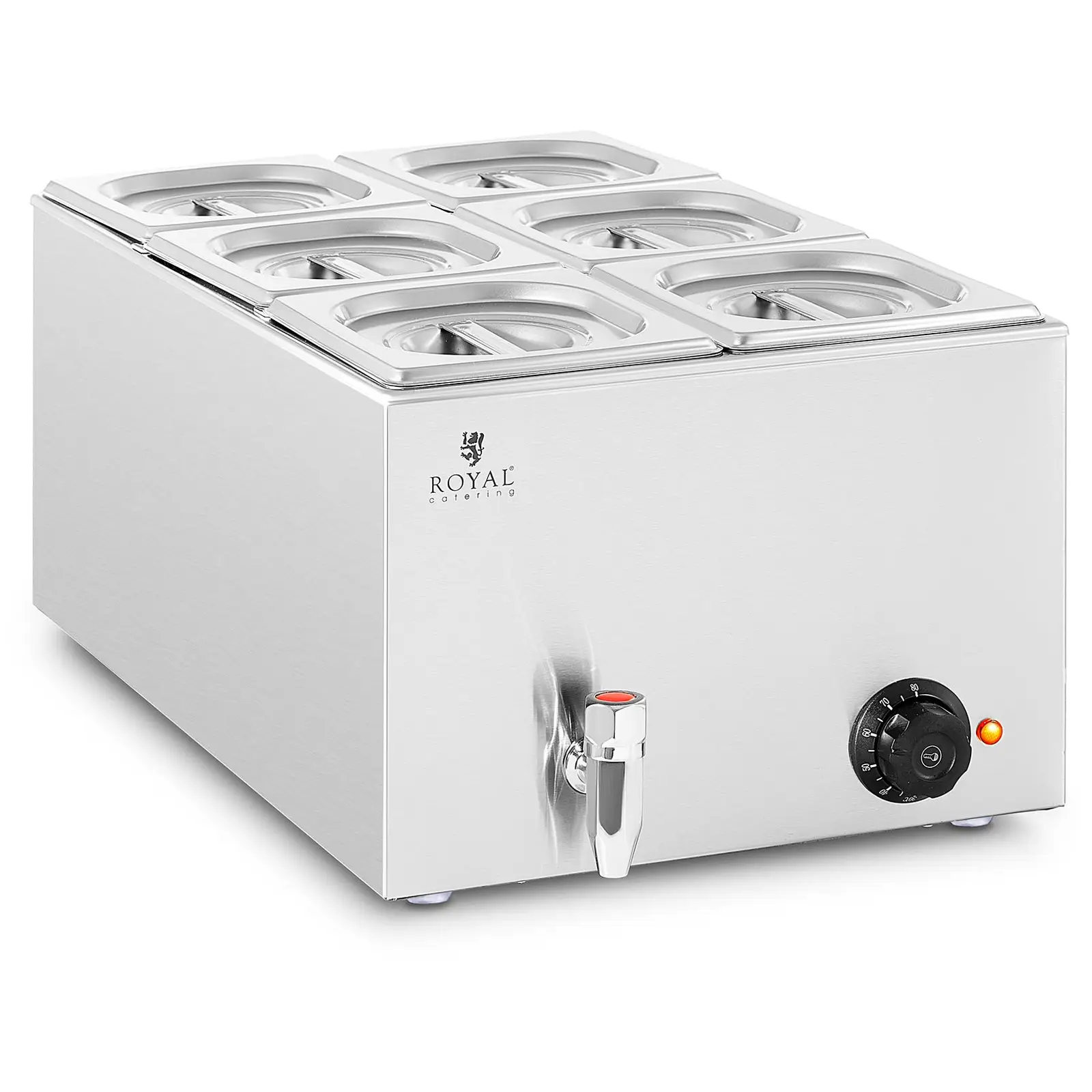 Bain-marie de la Royal Catering este perfect potrivit pentru menținerea alimentelor calde, menținându-le la temperatura potrivită pentru perioade lungi de timp. Recipientele 6 Gastronorm pot ține toate componentele unei mese sau diverse feluri de mâncare precum carne, pește, legume, orez, cartofi și sosuri la temperatura dorită în paralel, fără a le arde. Încălzitorul de mâncare răspunde nevoilor oricărei unități de servicii alimentare de lux, precum și restaurante, hoteluri, cantine, bufete, snack-baruri, săli de mese sau case de bătrâni și spitale.