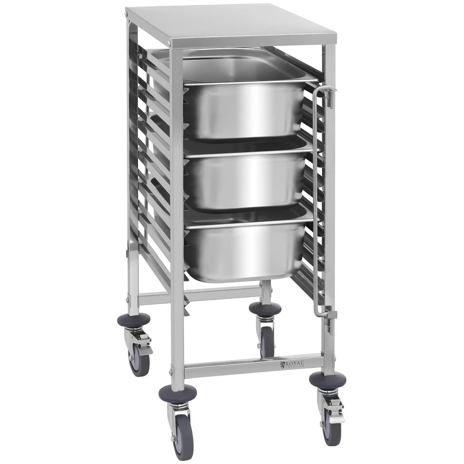 Căruciorul de servire RCTW 7 GN1/1 de la Royal Catering a fost special conceput pentru uz profesional în gastronomie și are o gamă largă de aplicații. Bucătării mari, cantine, spitale sau brutării - căruciorul din oțel inoxidabil de la Royal Catering pentru procese de lucru mai eficiente - la prețuri imbatabile și calitate supremă.