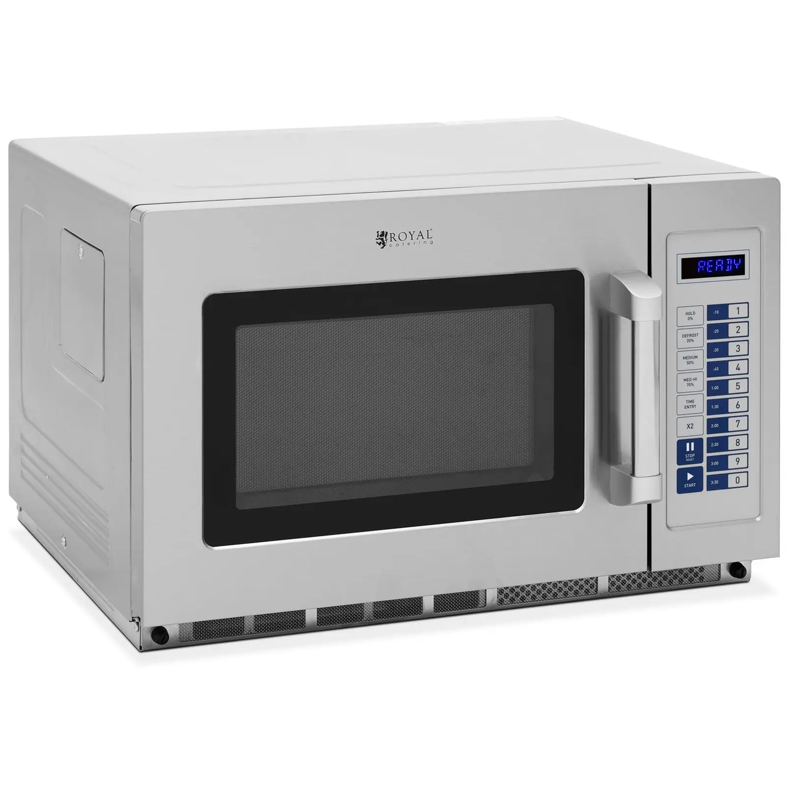 Puternicul 3200 W cu microunde într-o carcasă din oțel inoxidabil de înaltă calitate, cu o parte frontală din sticlă călită, de la Royal Catering's catering supplies. Cu diferite niveluri de putere și programe, cuptorul cu microunde este ideal pentru decongelarea, încălzirea și prepararea rapidă a unei mari varietăți de feluri de mâncare și mese în cafenele, baruri, snack baruri sau restaurante.