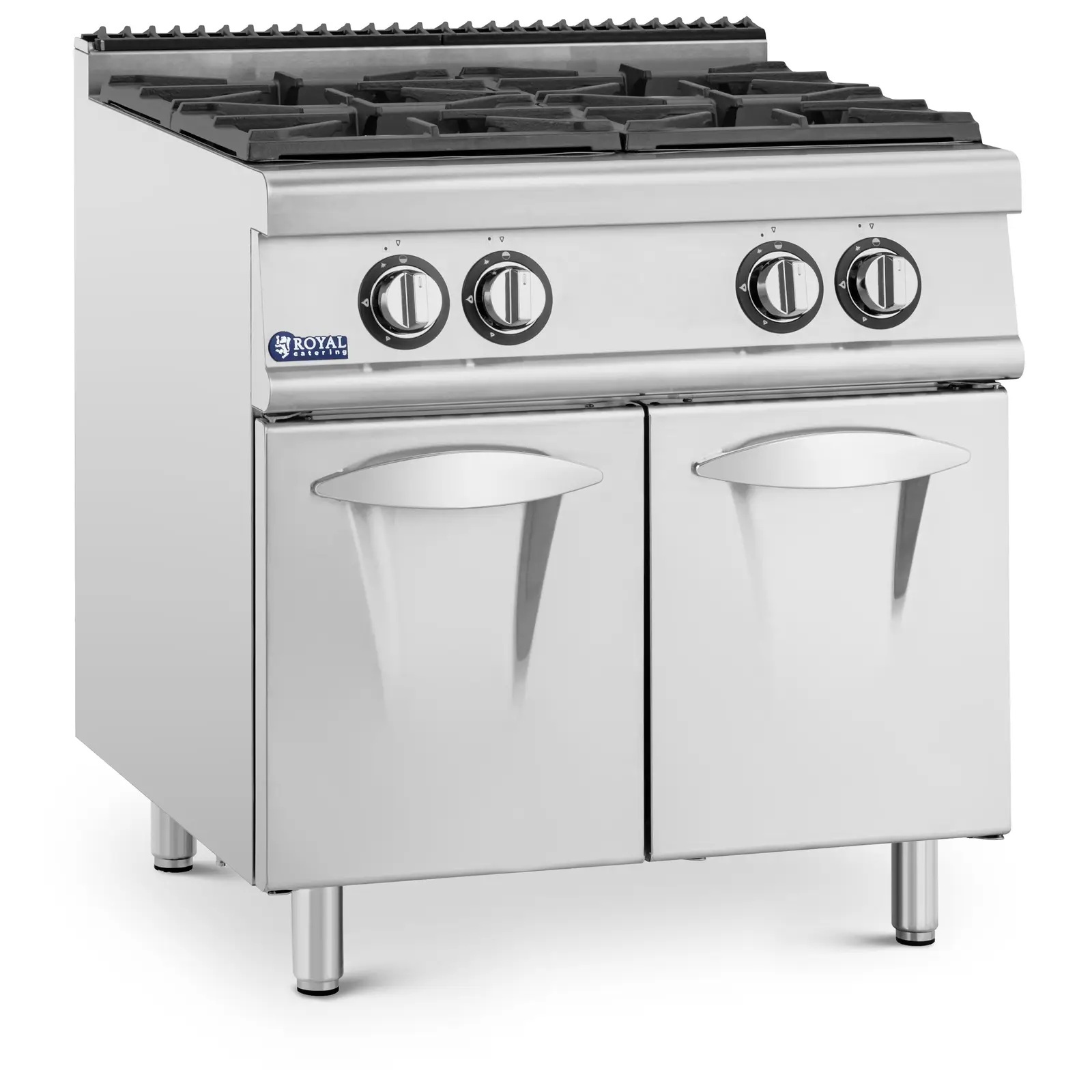 Funcționalitate, durabilitate și eleganță combinate: Cu aragazul pe gaz de sine stătător cu 4 arzătoare și un dulap, vă puteți echipa profesional bucătăria. Această unitate de 14,3 kW se potrivește perfect bucătăriilor comerciale, hotelurilor, restaurantelor sau căminelor datorită controlului precis al temperaturii și caracteristicilor de siguranță. Sub arzătoare, există un dulap spațios pentru oale, tigăi și alte ustensile de bucătărie, care le păstrează fără praf. Îl puteți deschide prin intermediul a două uși cu balamale și aveți acces rapid la materialele de lucru.