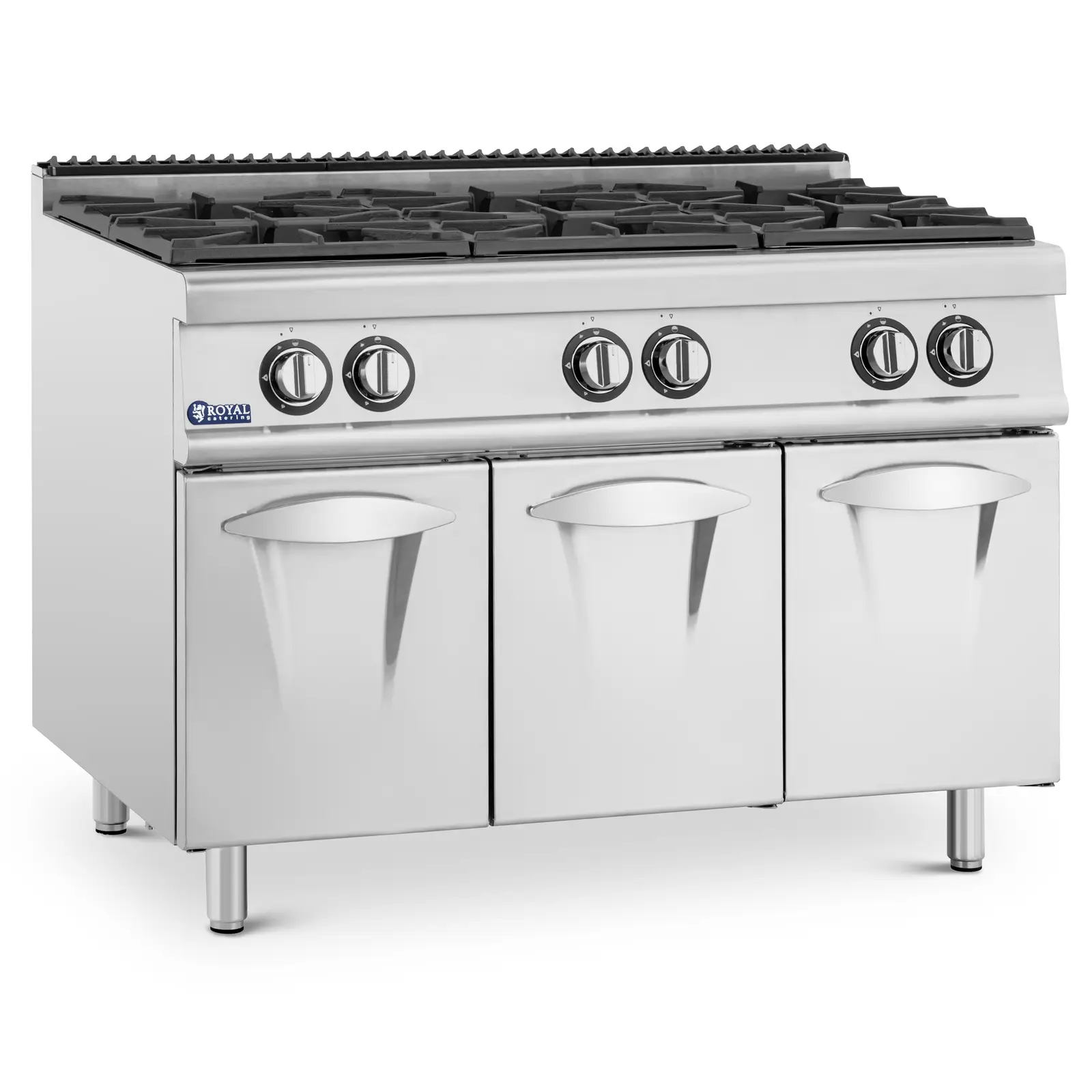 Funcționalitate, durabilitate și eleganță combinate: Cu aragazul pe gaz de sine stătător cu 6 arzătoare și un dulap, vă puteți echipa profesional bucătăria. Această unitate de 21,6 kW se potrivește perfect bucătăriilor comerciale, hotelurilor, restaurantelor sau căminelor datorită controlului precis al temperaturii și caracteristicilor de siguranță. Sub arzătoare, există un dulap spațios pentru oale, tigăi și alte ustensile de bucătărie, care le păstrează fără praf. Îl puteți deschide prin intermediul a 3 uși cu balamale și aveți acces rapid la materialele dvs. de lucru.