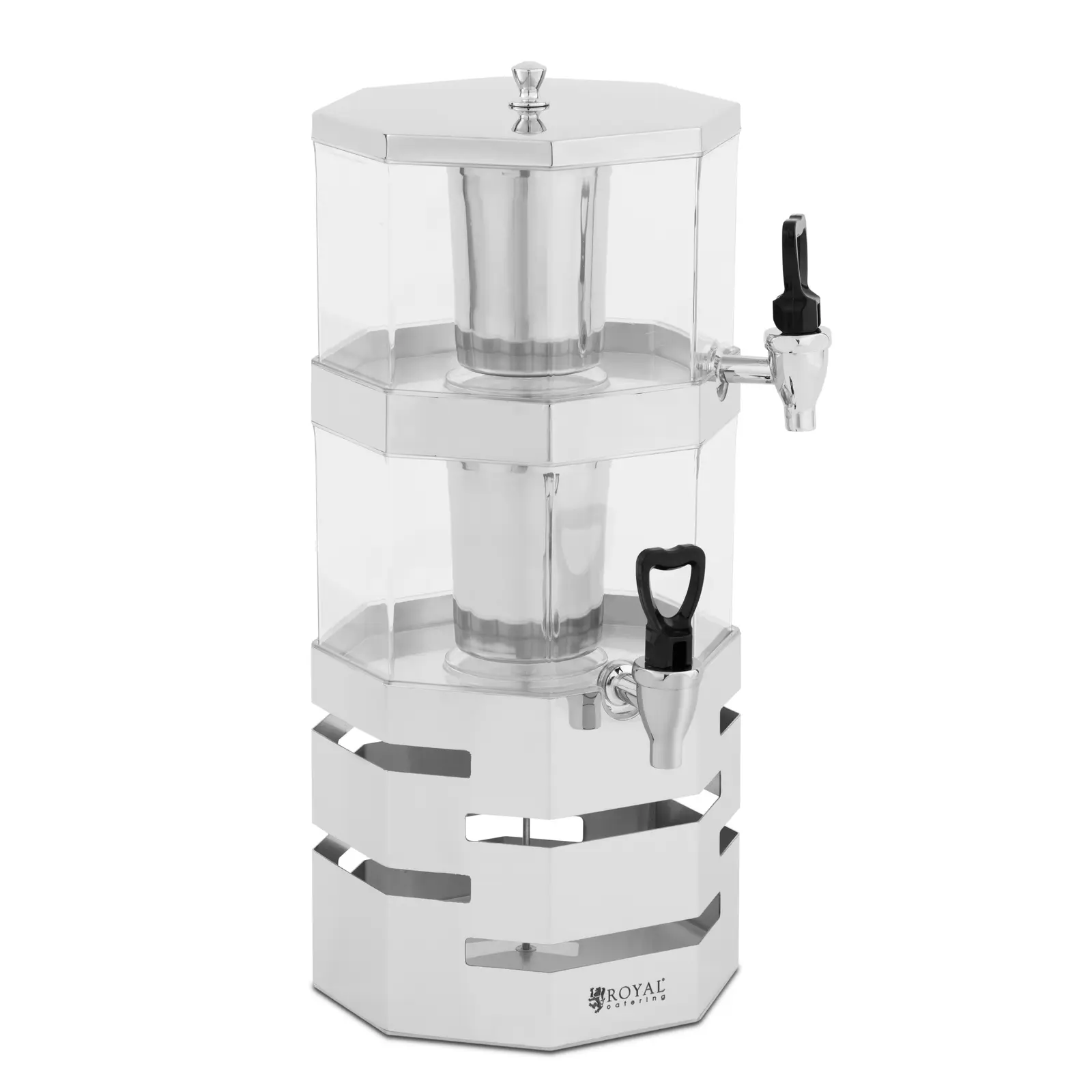 Dispenserul de băuturi octogonal distinctiv, cu o bază din oțel inoxidabil și rezervoare transparente, este o adevărată atracție. Recipientele din plastic de 4 litri sunt perfecte pentru bufetele aglomerate datorită capacității lor mari. De asemenea, puteți afișa atractiv suc, apă, ceai și alte băuturi în recipientele transparente, monitorizând în același timp cu ușurință nivelul de umplere. Când este necesar, completați ușor prin ridicarea capacului. Atunci când este închis, capacul protejează împotriva prafului, insectelor și a altor contaminanți. Distribuitorul de suc este prevăzut cu două robinete fără picurare, fiecare cu un mâner convenabil. În acest fel, dvs. sau invitații dvs. puteți distribui exact cantitatea dorită de suc și puteți închide din nou dispenserul în siguranță. Datorită debitului ridicat al robinetelor, cozile lungi de persoane însetate care frecventează bufetul fac parte din trecut.