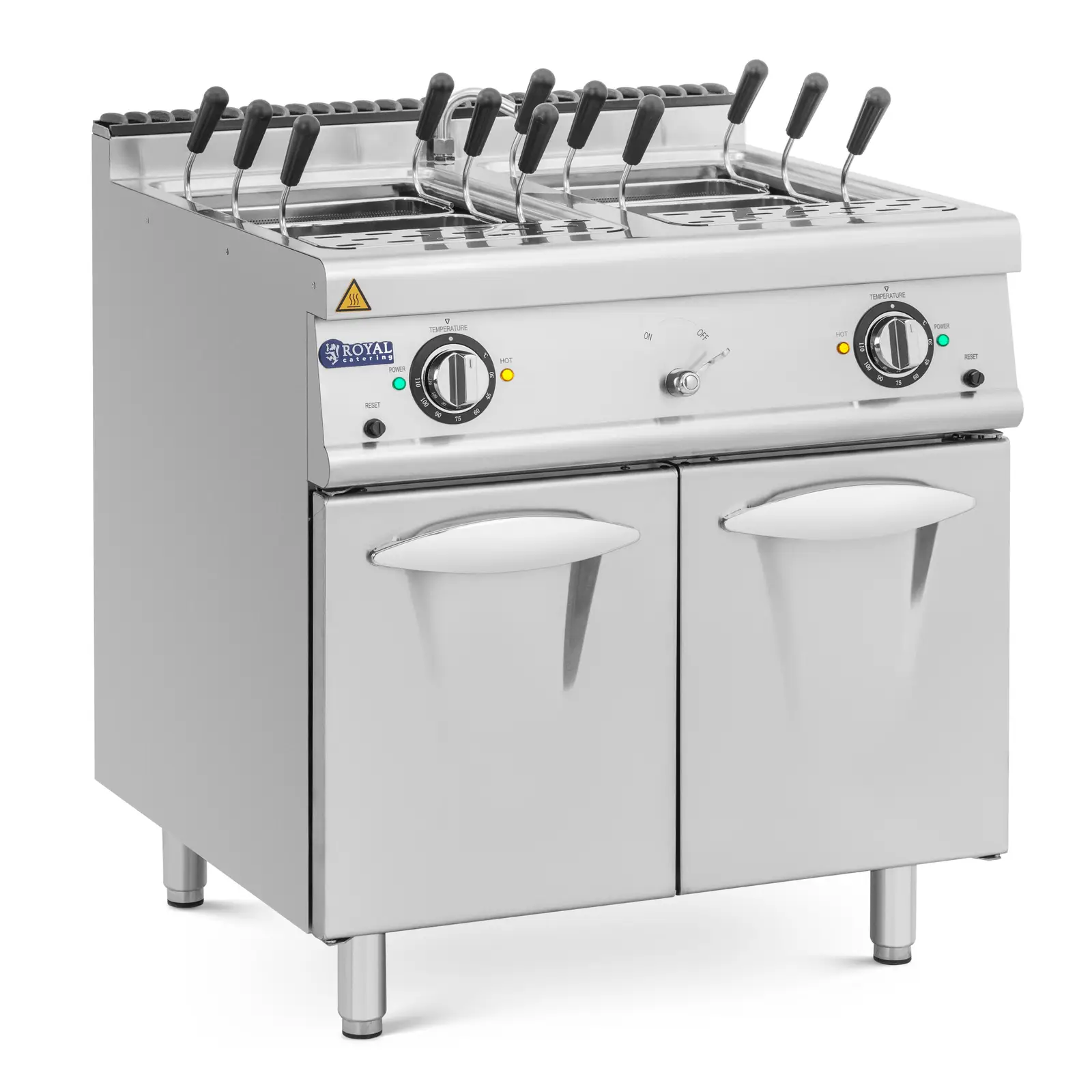 Electro-Nudelkocher - 18 kW - 400 V - 80 x 73 cm - Seria Pro 730 - Royal CateringAparat pentru paste} cu 4 coșuri - temperatura: 30 - 110 °CAparat de gătit paste cu 4 coșuri de strecurareGătitor de paste pe gaz - 4 x 4 kW - Propan / GPL / Gaz natural - 80 x 73 cm - Seria Pro 730 - Royal CateringAparat de gătit paste cu 6 coșuri de strecurareAparat pentru paste} cu 6 coșuri - temperatura: 30 - 110 °C