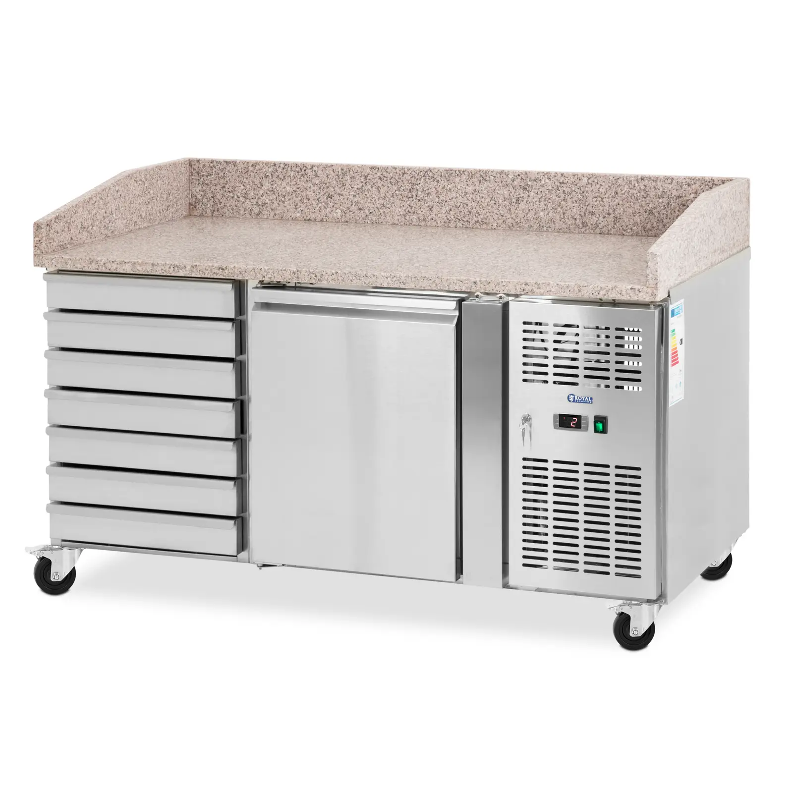 Masa frigorifică Royal Catering garantează disponibilitatea ingredientelor proaspete pentru o prelucrare rapidă. Unul dintre principalele avantaje ale acestui model este capacitatea sa generoasă de 165 l. Sub suprafața de lucru din granit, veți găsi șapte sertare și un compartiment de răcire spațios care poate fi împărțit cu un raft reglabil pe înălțime. Într-o bucătărie agitată, mecanismul de deschidere și închidere lină a celor două uși batante facilitează munca rapidă - mai ales atunci când aveți mâinile ocupate.