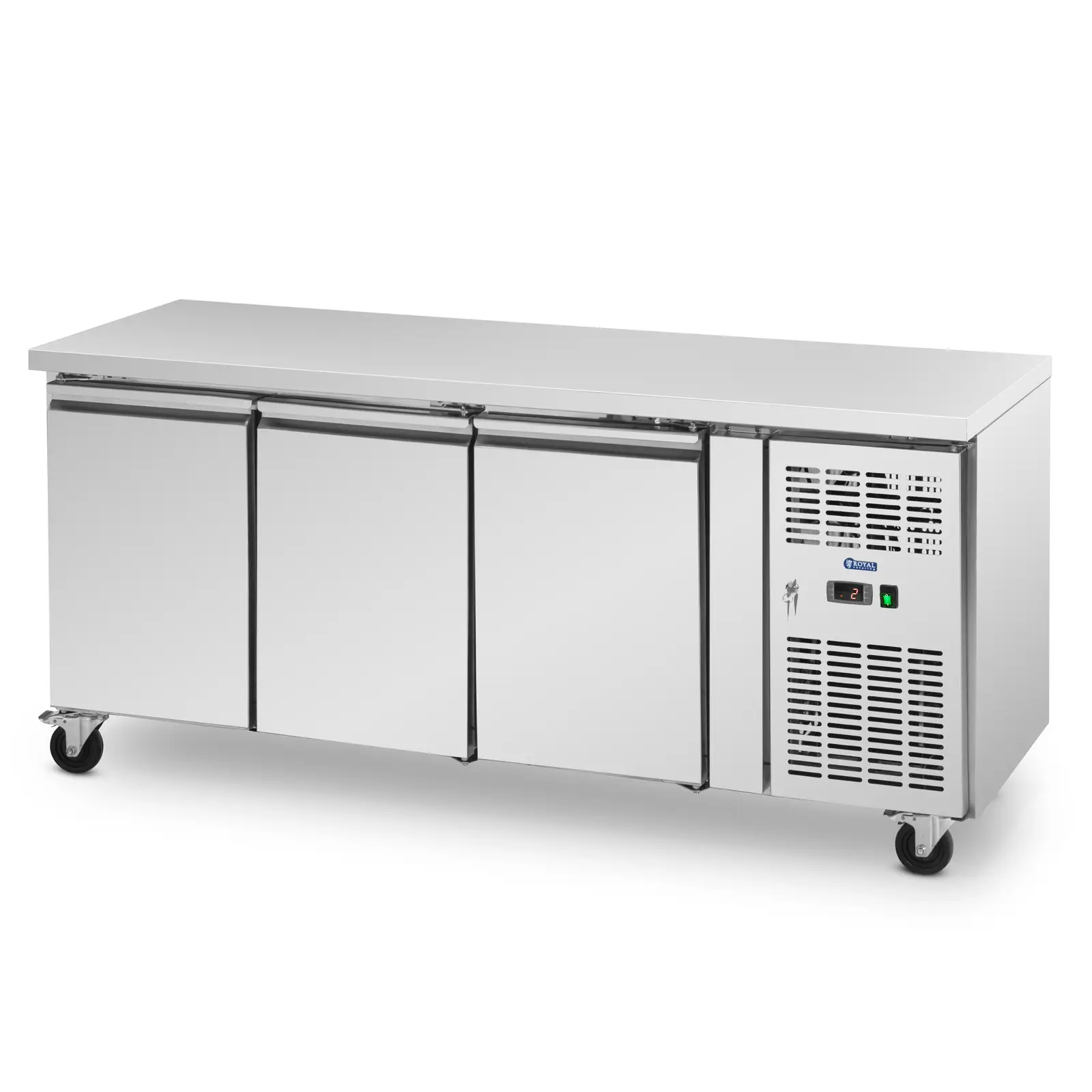Masa frigorifică Royal Catering garantează disponibilitatea ingredientelor proaspete pentru o prelucrare rapidă. Echipamentul profesional de refrigerare de la Royal Catering a fost dezvoltat pentru restaurante, cafenele, baruri cu servire rapidă sau hoteluri, dar acest produs este, de asemenea, incredibil de valoros în pizzerii, baruri de salate și magazine de kebab și falafel. Masa frigorifică pentru catering este deosebit de ușor de mutat. Aparatul este așezat pe 4 rotile rezistente, care se deplasează fără probleme pe podele inegale. 2 frânele de parcare blochează roțile imediat ce tejgheaua frigorifică se află în poziția dorită.