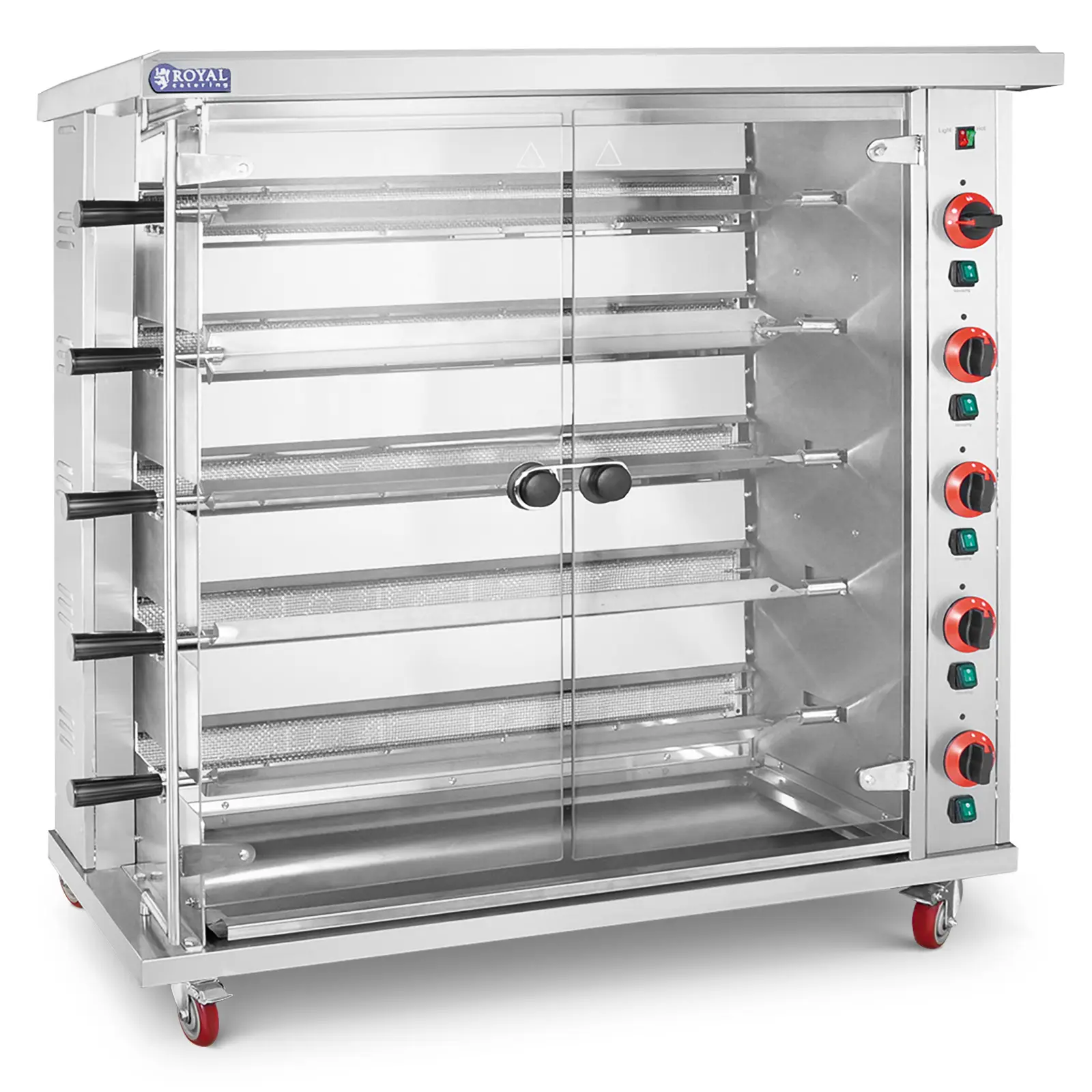Grătarul de pui Gastro garantează o utilizare sigură printr-un ventil de gaz integrat cu element termic, care previne în mod fiabil pierderile de flacără. Materialele de înaltă calitate, inclusiv un carcasă robustă din oțel inoxidabil și uși detașabile din sticlă călită, oferă igienă, durabilitate și rezistență la coroziune și influențe externe. Alimentarea flexibilă cu gaz permite o adaptare ușoară la diferite tipuri de gaz. Grătarul de pui este presetat din fabrică pentru conexiunea de gaz I3B/P(50), dar poate fi adaptat cu ușurință la GPL sau gaz natural datorită seturilor de injectoare furnizate. Datorită celor patru roți mari de 3'' (7,6 cm), puteți plasa grătarul de pui cu rotisor exact acolo unde aveți nevoie. Totuși, un stand stabil este garantat datorită construcției solide și a frânelor de blocare.
