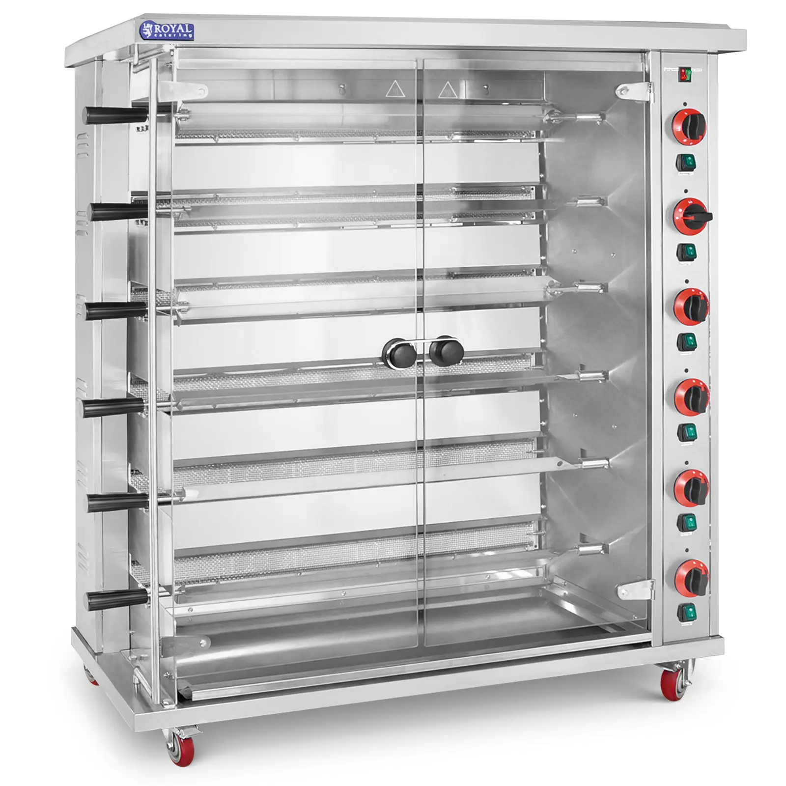 Grătarul de pui Gastro asigură o utilizare sigură printr-un ventil de gaz integrat cu termoelement, care previne în mod fiabil pierderile de flacără. Materialele de înaltă calitate, inclusiv un carcasă robustă din oțel inoxidabil și uși detașabile din sticlă călită, oferă igienă, durabilitate și rezistență la coroziune și influențe externe. Alimentarea flexibilă cu gaz permite o adaptare ușoară la diferite tipuri de gaz. Grătarul de pui este din fabrică presetat pentru conexiunea de gaz I3B/P(50), dar poate fi ușor adaptat pentru GPL sau gaz natural datorită seturilor de injectoare incluse. Datorită celor patru roți mari de 3'' (7,6 cm), puteți plasa grătarul de pui cu rotisor ușor acolo unde aveți nevoie. Totuși, un suport ferm este garantat datorită construcției stabile și frânelor de blocare.