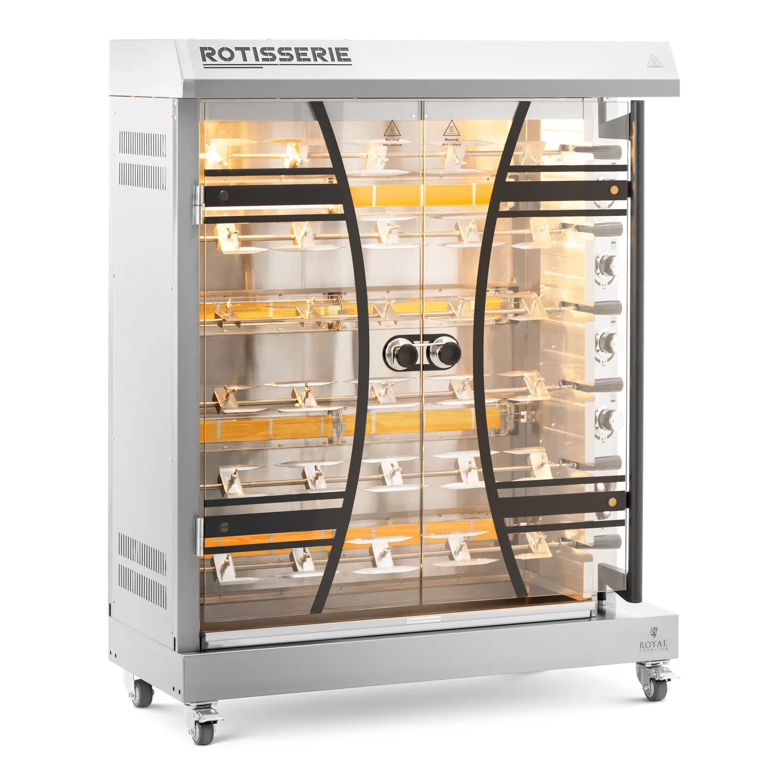 Cu grătarul de pui de la Royal Catering oferiți clienților dumneavoastră pui delicioși, roastbeef, porchetta, fripturi pe băți și multe alte delicatese preparate proaspete și crocante. Pe șase băți rotative, cu loc pentru câte patru pui fiecare, pregătiți specialitățile dorite uniform fragede și cu o crustă crocantă. Pentru aceasta, activați zonele de încălzire independent una de cealaltă, astfel încât să puteți prepara chiar și diferite feluri de mâncare în paralel. Grătarul de pui pe gaz se pornește confortabil prin aprindere piezoelectrică. Dispozitivul este setat din fabrică pentru tipul de gaz I3B/P(50), dar datorită injectoare incluse, este potrivit și pentru gaz natural sau gaz lichefiat.