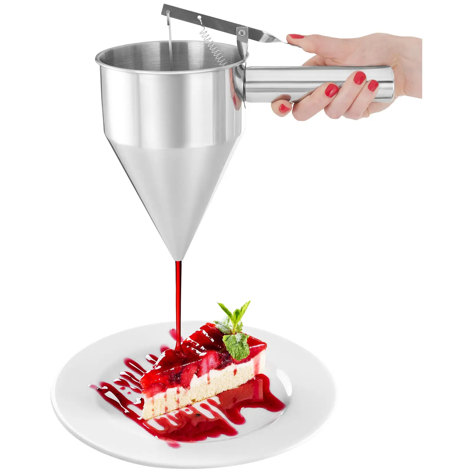 Pâlnia cu piston RCFT-1.3 de la Royal Catering vă permite să măsurați cu ușurință și cu precizie sosurile, lichiorurile, toppingurile etc., precum și să umpleți și să decorați ciocolata, produsele de patiserie sau deserturile. Datorită mecanismului său practic și a materialelor de înaltă calitate, acest ajutor de bucătărie este deosebit de potrivit pentru brutării, patiserii și bucătării.