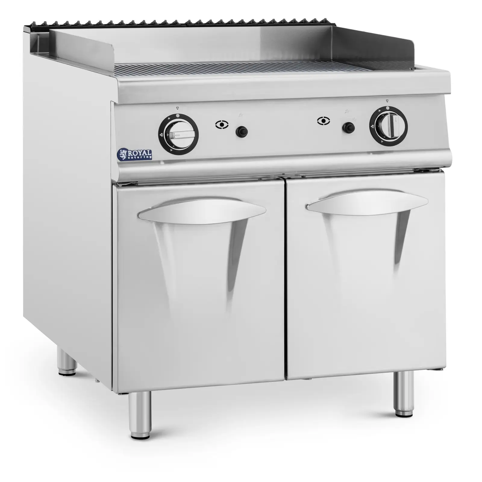 Cu plita pe gaz Royal Catering, puteți pregăti cârnați, șuncă, burgeri, legume și pâine prăjită în cel mai scurt timp! Modelul robust cu o placă de grătar din oțel cromat este ideal pentru industria de catering, fie că este vorba de hoteluri, cafenele, standuri de gustări, bistrouri, baruri, restaurante sau evenimente de catering de orice fel. Sub suprafața cu nervuri a grătarului, există un dulap încăpător pentru oale, tigăi și alte ustensile de bucătărie, care le păstrează fără praf. Îl puteți deschide prin intermediul a două uși cu balamale și aveți acces rapid la materialele de lucru.