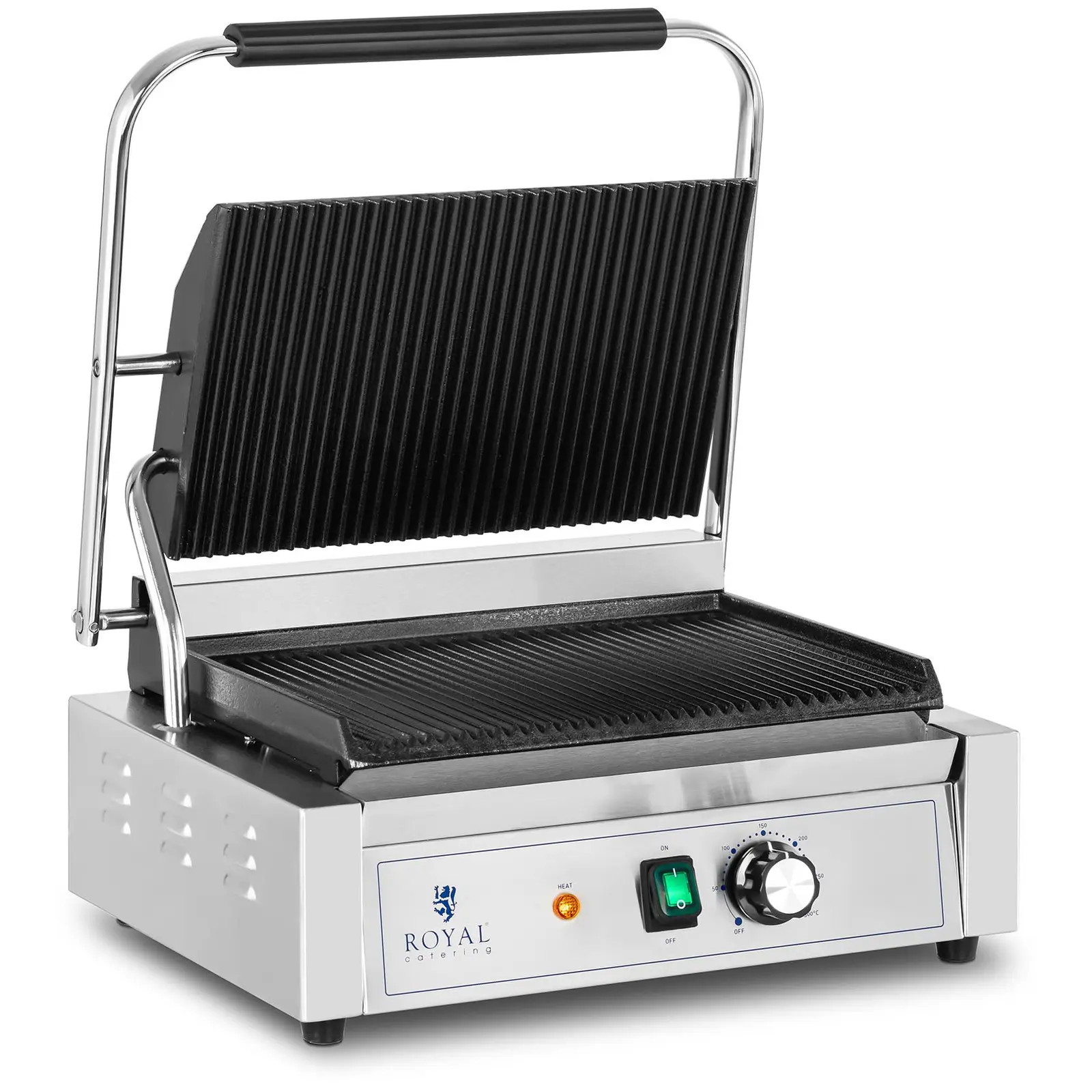Grătarul de contact RCPKG-2200-R de la Royal Catering este un echipament profesional de gătit conceput pentru restaurante de hotel, cafenele, restaurante fast-food și companii de catering, precum și pentru uz privat. Grătarul de contact din colecția de echipamente de catering a 10057 este flexibil și, datorită suprafeței mari de grătar, este perfect pentru prepararea gustărilor precum panini, sandvișuri, legume la grătar, burgeri, fripturi și alte specialități.