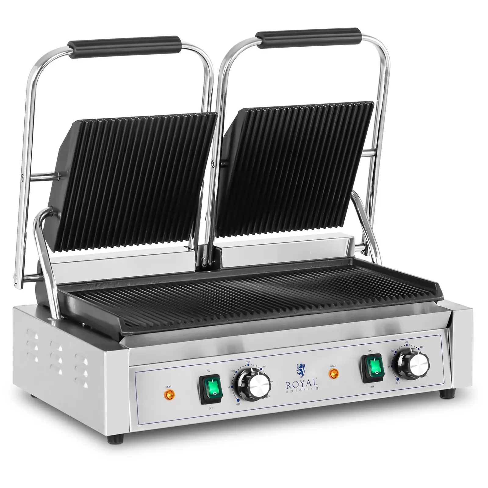 Gratarul dublu contact RCPKG-3600-R de la Royal Catering este un echipament profesional de gatit conceput pentru restaurante de hotel, cafenele, restaurante fast-food si companii de catering, precum si pentru uz privat. Grătarul de contact din colecția de echipamente de catering 10057 este flexibil și, datorită suprafeței sale mari, cu două grătar, este perfect pentru prepararea gustărilor precum panini, sandvișuri, legume la grătar, burgeri, fripturi și alte specialități.