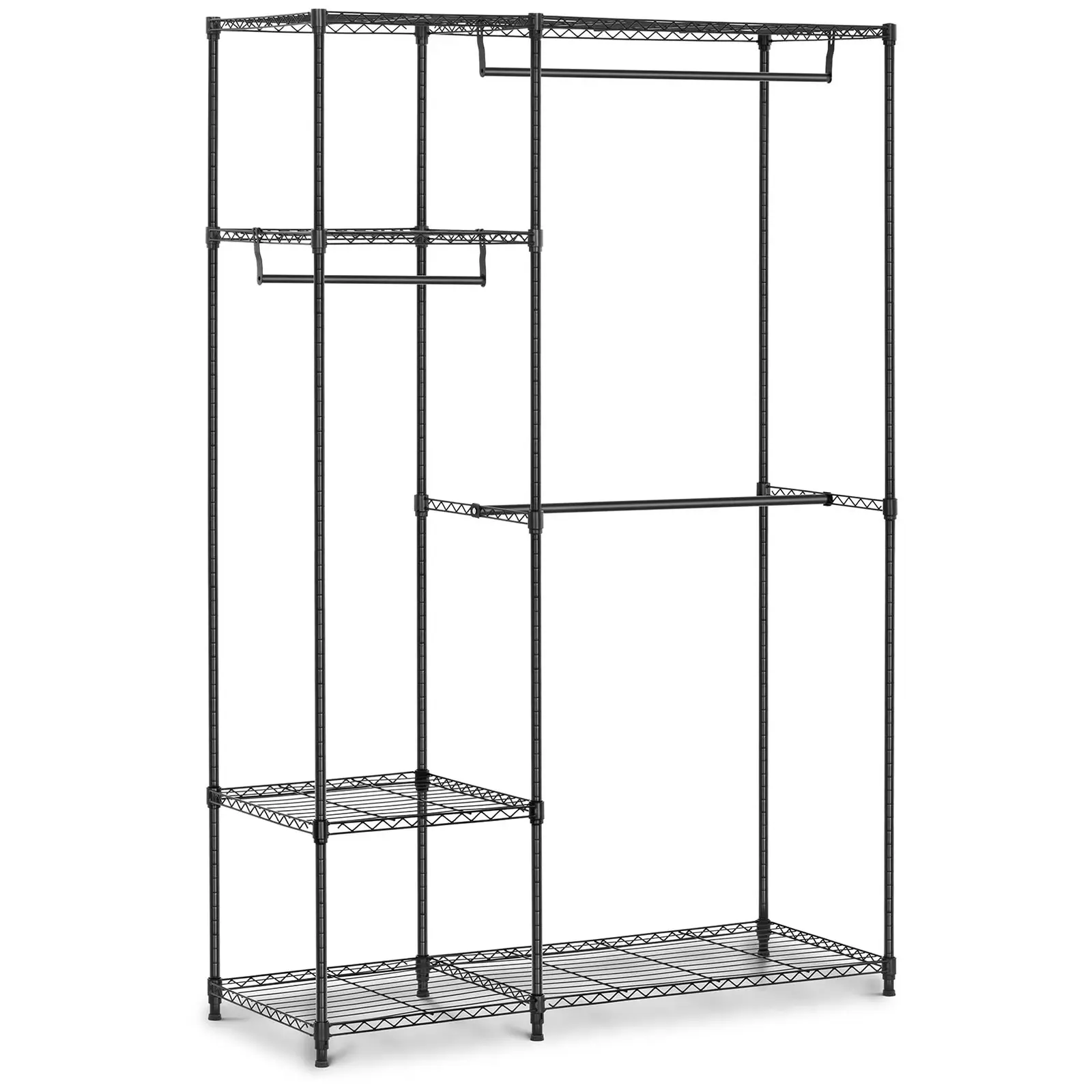Păstrați-vă jachetele, paltoanele și alte haine sau genți îngrijite și ordonate în eleganta bară metalică pentru haine. Patru rafturi și trei șine pentru haine oferă o mulțime de spațiu de depozitare. Cele două rafturi mai mici măsoară 45 x 45 cm; cele două mai mari măsoară 45 x 120 cm. Fiecare raft poate susține până la 40 kg. Cea mai înaltă dintre cele trei șine pentru haine măsoară 76 cm și poate susține 10 kg; în mijloc se află o șină de 45 cm lungime și, pe podea, o altă șină de 76 cm lungime; ambele pot susține 50 kg fiecare. Suportul de sârmă pentru haine poate susține o greutate totală de 270 kg.