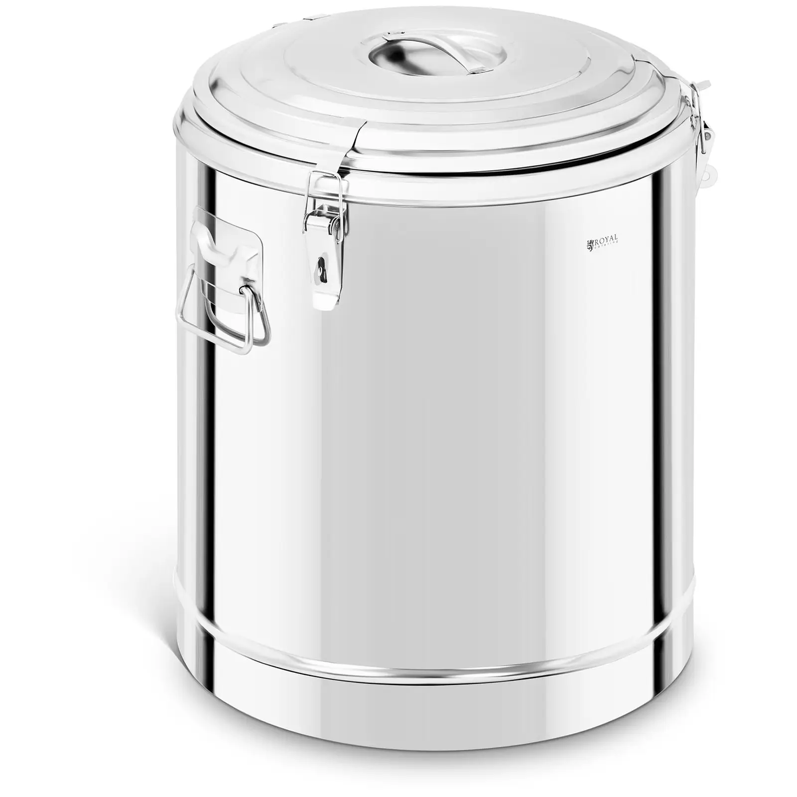 Recipientul termos din oțel inoxidabil este conceput pentru a face transportul alimentelor și băuturilor calde și reci simplu și sigur. Royal Catering - retailerul dvs. online pentru echipamente de catering - a proiectat special recipientul termos din oțel inoxidabil pentru restaurantele și hotelurile de lux, precum și pentru bucătăriile comerciale, cantinele și serviciile de livrare de catering. Dacă apreciați funcționalitatea, durabilitatea și designul atrăgător în echipamentul de bucătărie, atunci acest recipient termos izolat cu pereți dubli de 60 de litri este un ajutor indispensabil pentru a păstra mâncarea caldă.