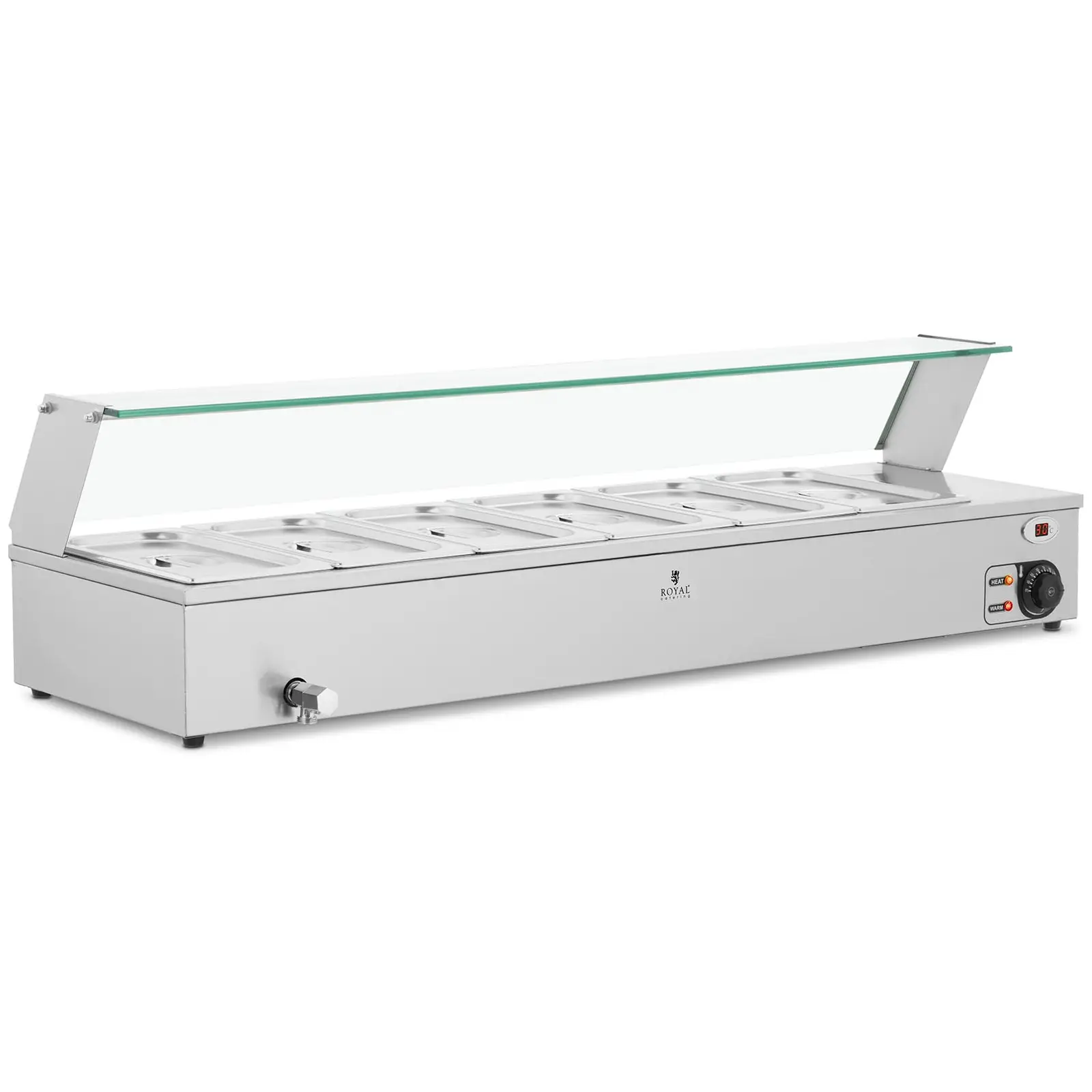 Vitrină Caldă - 6 Recipiente GN 1/3 - Royal CateringBufet Cald - 6 GN - cu accesoriu pentru carne și robinet de scurgereÎncălzitor de supă - 2 x 2,75 litri - 300 WBufet Cald - 5 x GN - 1/2 - Robinet de scurgereBufet Cald - 6 GN - cu atașament pentru carneÎncălzitor de supă - 1 x 2,75 litri - 150 W