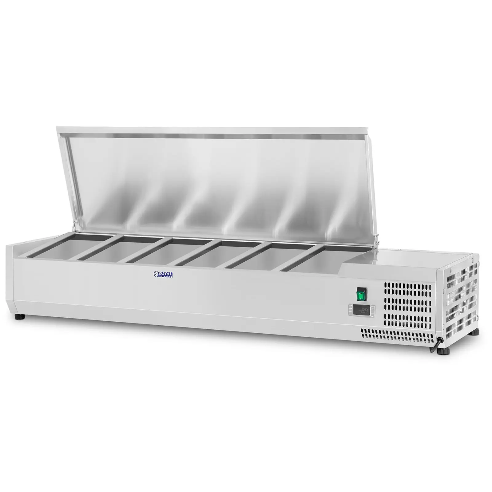 Vitrina frigorifică RCKV-140/33-6S de la Royal Catering păstrează alimentele proaspete și atractive, păstrându-le la rece și depozitându-le, fie că este vorba de servire sau de pregătire a mâncărurilor. Frigiderul profesional Royal Catering a fost proiectat pentru restaurante, cantine, gelaterie, baruri, hoteluri etc. Este, de asemenea, un dispozitiv neprețuit pentru pizzerii și salate.