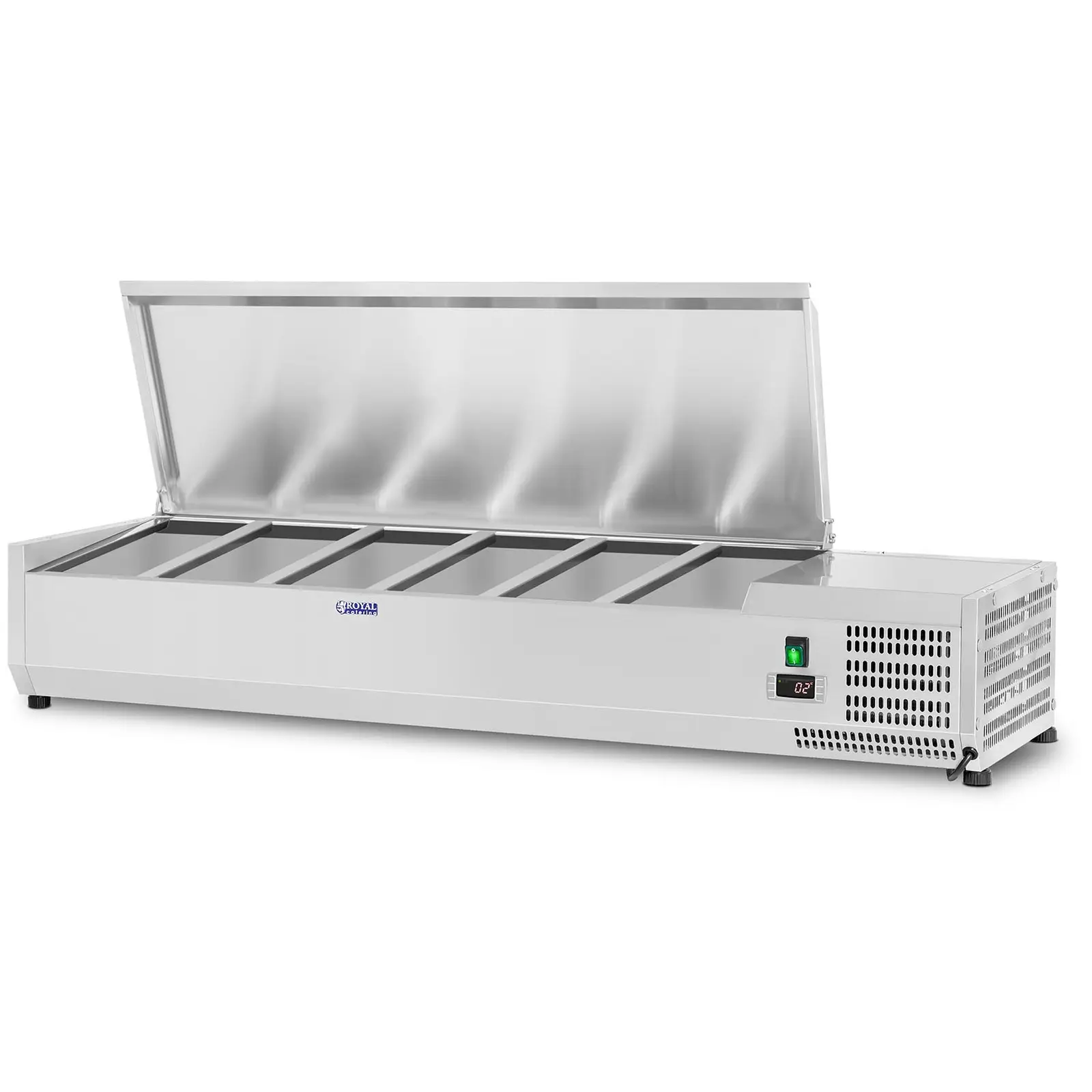 Vitrina frigorifică RCKV-140/39-S5 de la Royal Catering păstrează alimentele proaspete și atractive, menținându-le la rece și depozitându-le, fie că este vorba de servire sau de pregătirea mâncărurilor. Frigiderul profesional Royal Catering a fost conceput pentru restaurante, cafenele, gelaterii, baruri, hoteluri etc. Este, de asemenea, un dispozitiv neprețuit pentru pizzerii și baruri de salate.