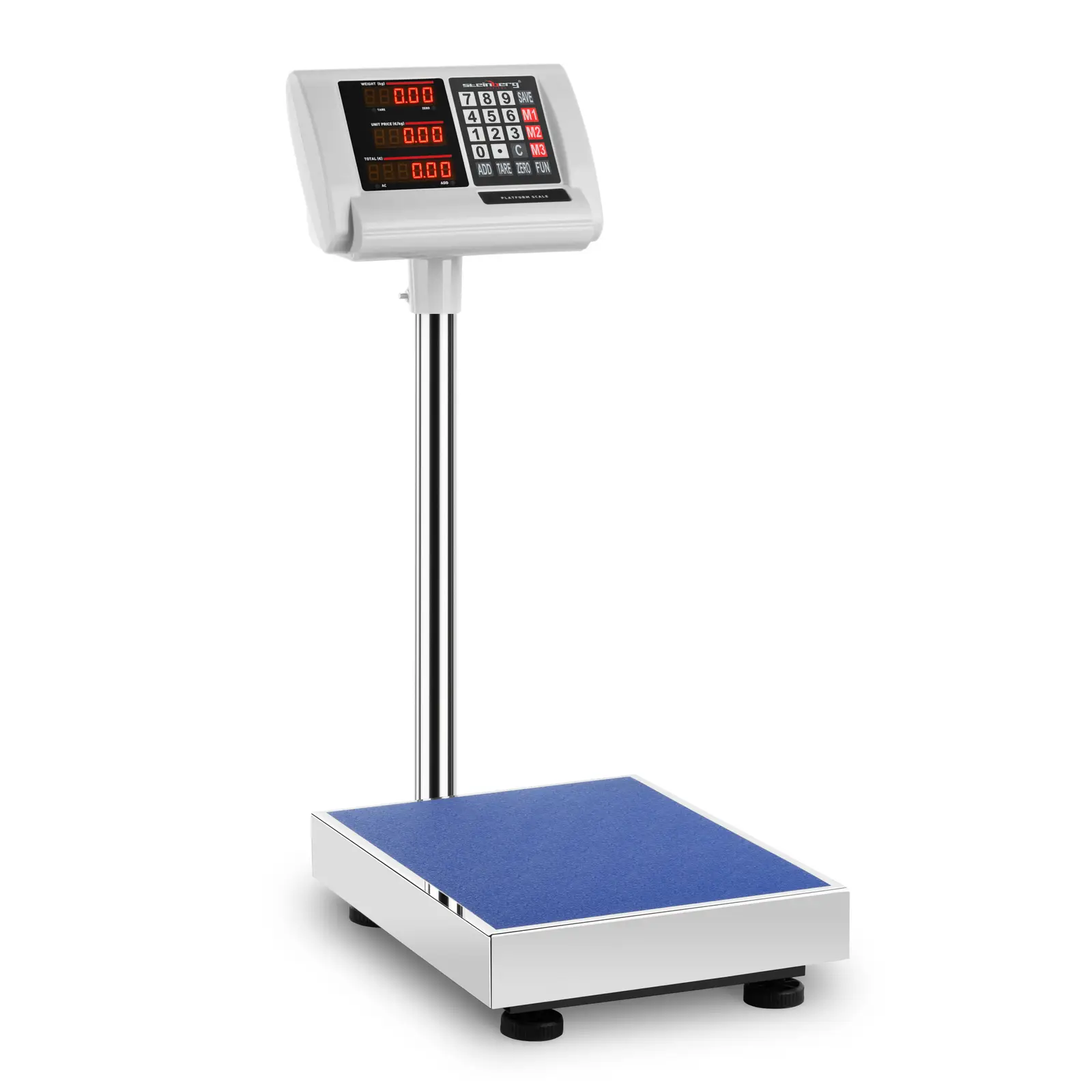 Afișajul LED clar lizibil, care este montat pe o țeavă, are iluminare de fundal care poate fi setată la unul dintre cele trei niveluri de luminozitate. Cele trei afișaje arată greutatea, prețul pe kg în EUR sau USD și prețul total în cifre înalte de 15 mm. Puteți utiliza panoul de control pentru a introduce valorile, a alege funcțiile și a salva prețurile.
