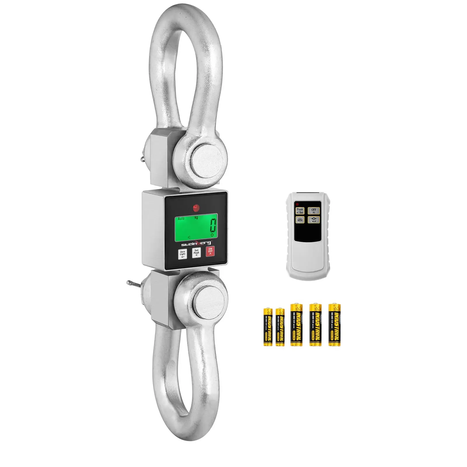 Livrarea include un cârlig rotativ de siguranță din oțel aliat pentru greutăți suspendate și 3 baterii AA de 1,5 V pentru cântar și 2 baterii AAA pentru telecomandă. Datorită opririi automate, bateriile asigură funcționarea până la 24 de ore cu iluminare de fundal. Acest lucru garantează că puteți utiliza cântarul macaralei Steinberg Systems imediat.