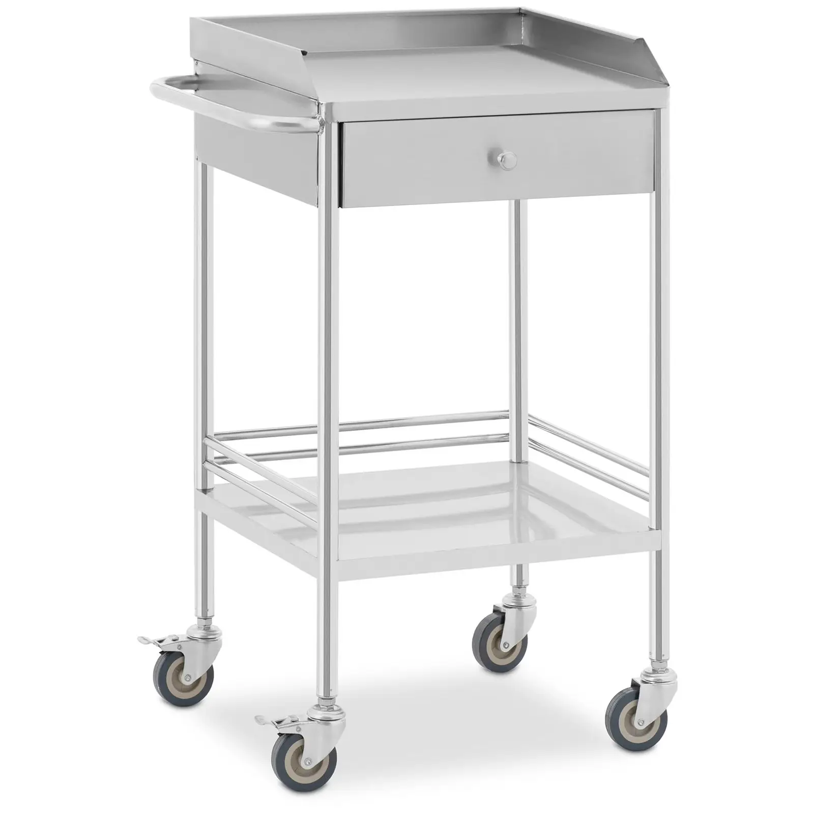 Cărucior de laborator - 2 rafturi fiecare 43 x 39 x 13 cm - 1 sertar - 40 kgCărucior pentru instrumente - 3 roți - 60 x 40 mm - înălțime reglabilă - oțel inoxidabil / cauciucCărucior de laborator - 3 rafturi fiecare 54 x 38 x 5 cm - 30 kg