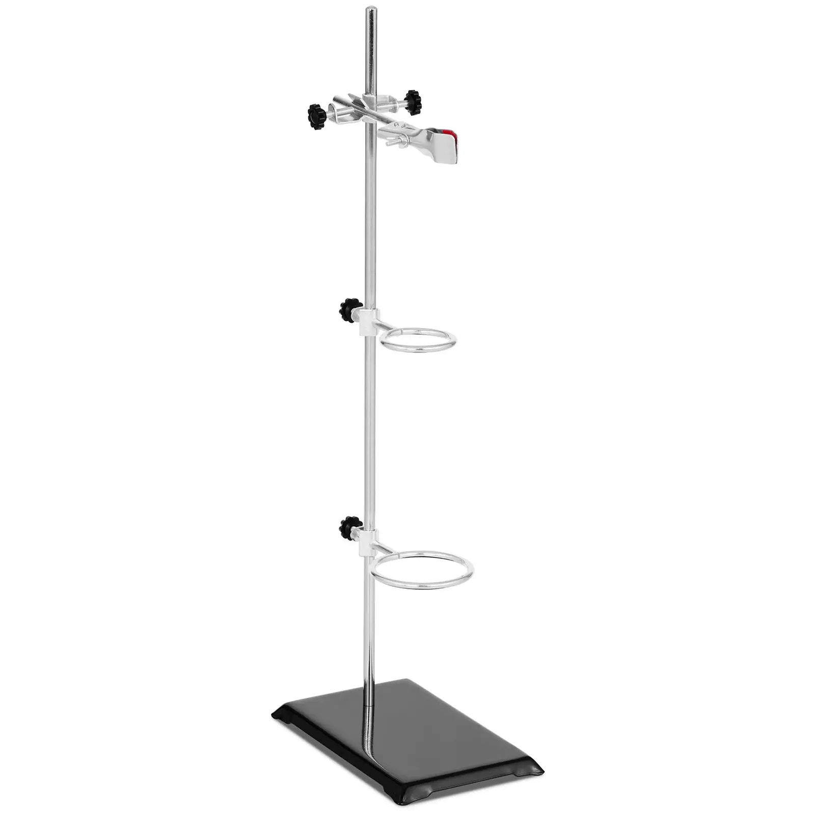 De la inceput va spun ca prea multe optiuni in piata nu exista. Credeam ca o sa primesc un produs de slaba calitate, piata e invadata de produse chinezesti, insa am avut placuta surpriza sa gasesc un produs made in EU (Polonia) de foarte foarte buna calitate, durabil pentru o viata as putea spune. Tija e din otel plin, greu, cromat, drept si fara imperfectiuni. Baza este din tabla de otel groasa, 4mm, grea, vopsita powder coated in camp electrostic. Tija se strange cu piulita si saiba, am strans serios cu o cheie tubulara de 14mm. Tija este perpendiculara pe baza. Clemele si suportii cu care vine sunt de cea mai buna calitate si ei, durabili. Setul este destinat bio-chimiei insa poate fi usor de folosit si in fizica. Avantajul acestui set este ca permite ca obiectul/recipientul sustinut sa fie in centrul de greutate al intregului sistem, tija fiind deplasata spre marginea suportului.