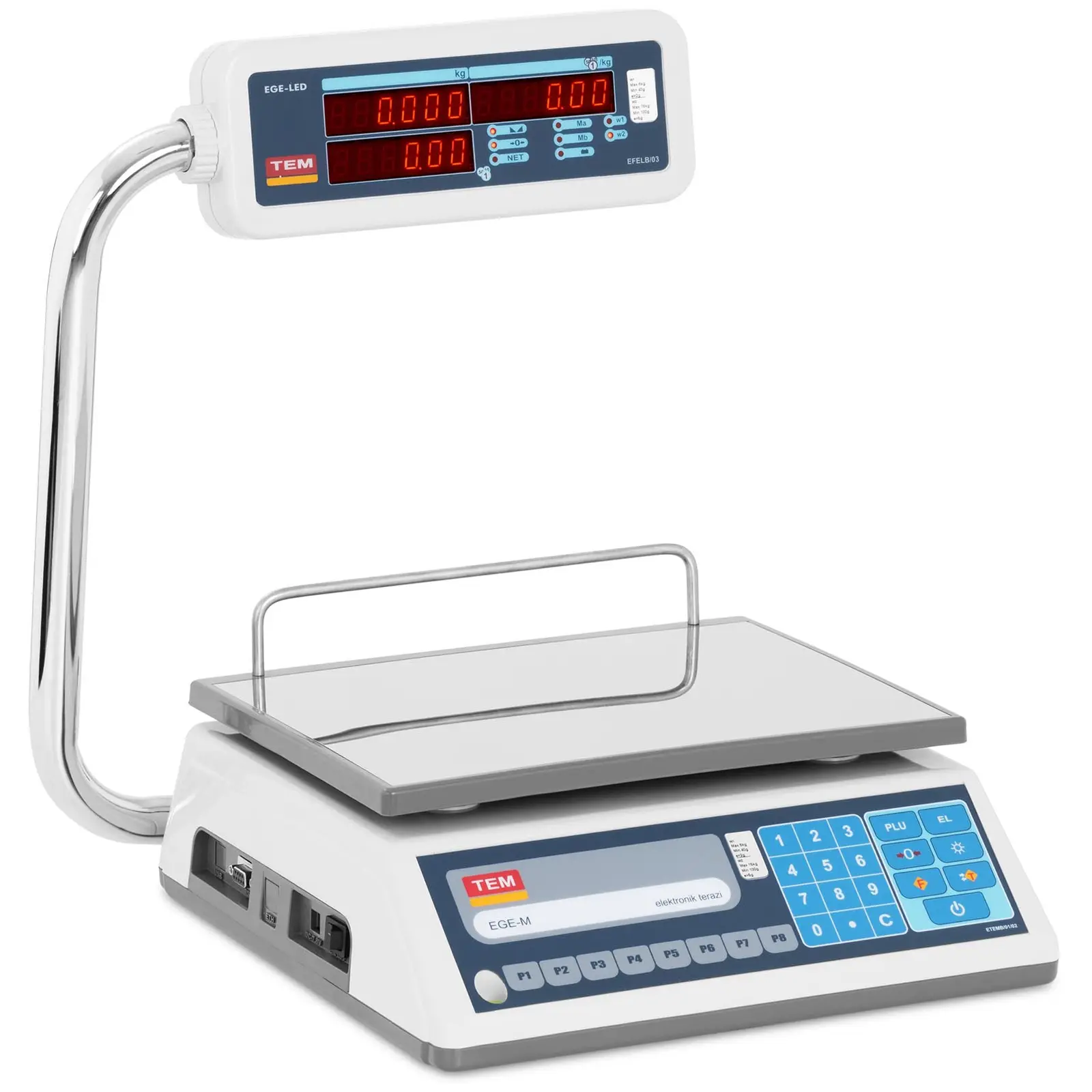 Cântarul pentru comerț cu amănuntul de la TEM oferă rezultate exacte de măsurare până la 15 kg. Valorile măsurate sunt afișate pe afișajele LED duble din față și din spate. Pentru o utilizare ușoară, cântarul pentru comerț cu amănuntul include, de asemenea, funcțiile Calculați prețul, Adăugați, Tăiați, Zero și Salvați. Acest cântar are 250 de spații de memorie accesibile. Panoul de comandă este rezistent la grăsime și apă.