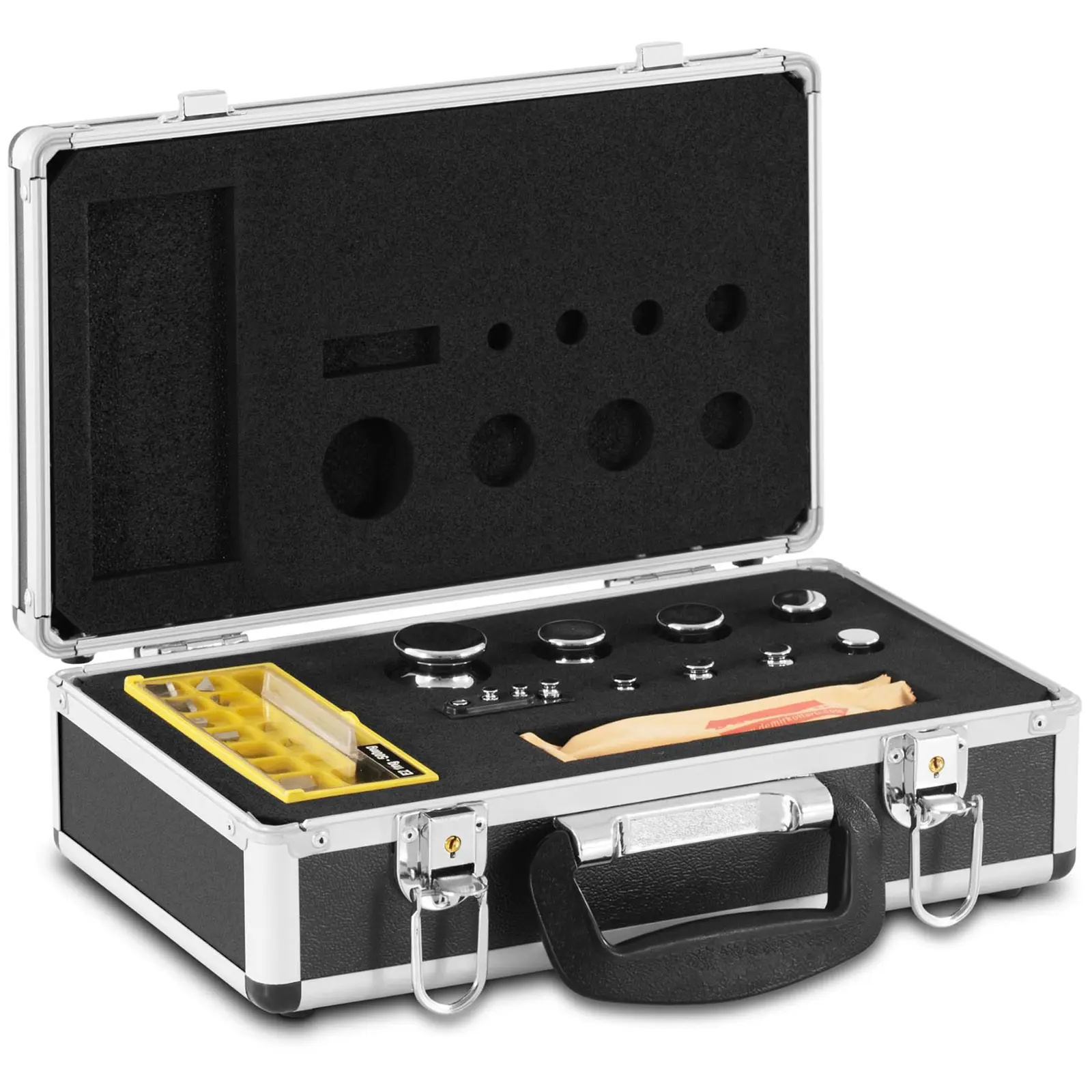 Setul de greutăți de calibrare a cântarului este fabricat din oțel inoxidabil și are o uzură extrem de redusă. Pentru o utilizare precisă, evitând contaminarea greutăților de calibrare pentru a asigura acuratețea măsurătorilor, setul este echipat cu o pensetă, o perie de praf și mănuși pentru manipularea greutăților. Greutățile sunt livrate într-o cutie de protecție din aluminiu în care greutățile de măsurare pot fi transportate și depozitate în siguranță.