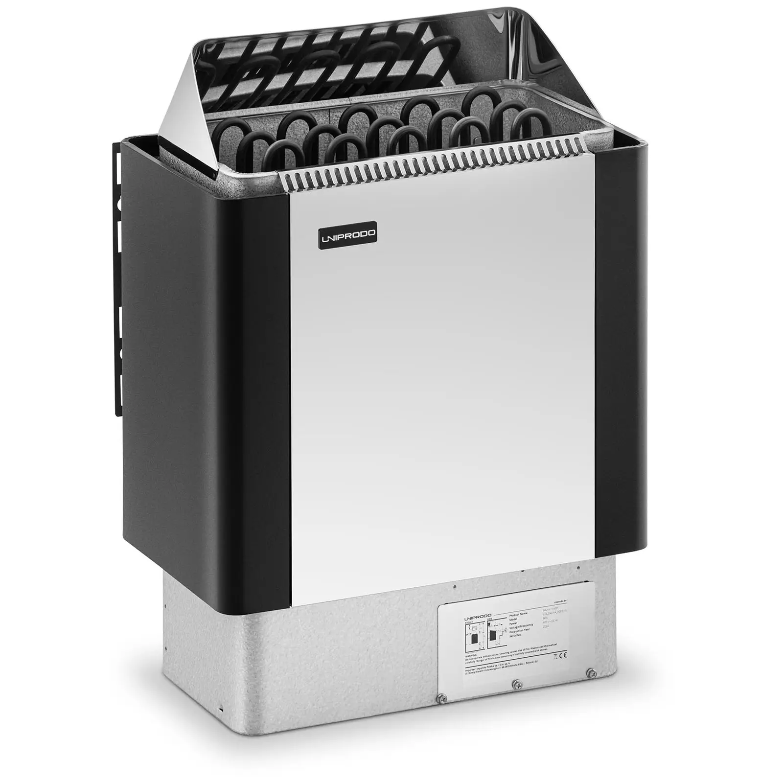 Coșul de pietre din interiorul încălzitorului robust poate conține până la 15 kg de pietre de saună - pietrele noastre de saună UNI_SAUNA_S01 de la Uniprodo sunt perfecte pentru acest scop. Recipientul de piatră și carcasa încălzitorului de saună sunt fabricate din aluminiu-zinc rezistent la coroziune, în timp ce panoul și deflectorul de aer sunt fabricate din oțel inoxidabil strălucitor. Elementele de încălzire puternice sunt protejate împotriva coroziunii. O protecție împotriva supraîncălzirii, care se activează la o temperatură de 115 °C, garantează sesiuni de saună sigure și fără griji.