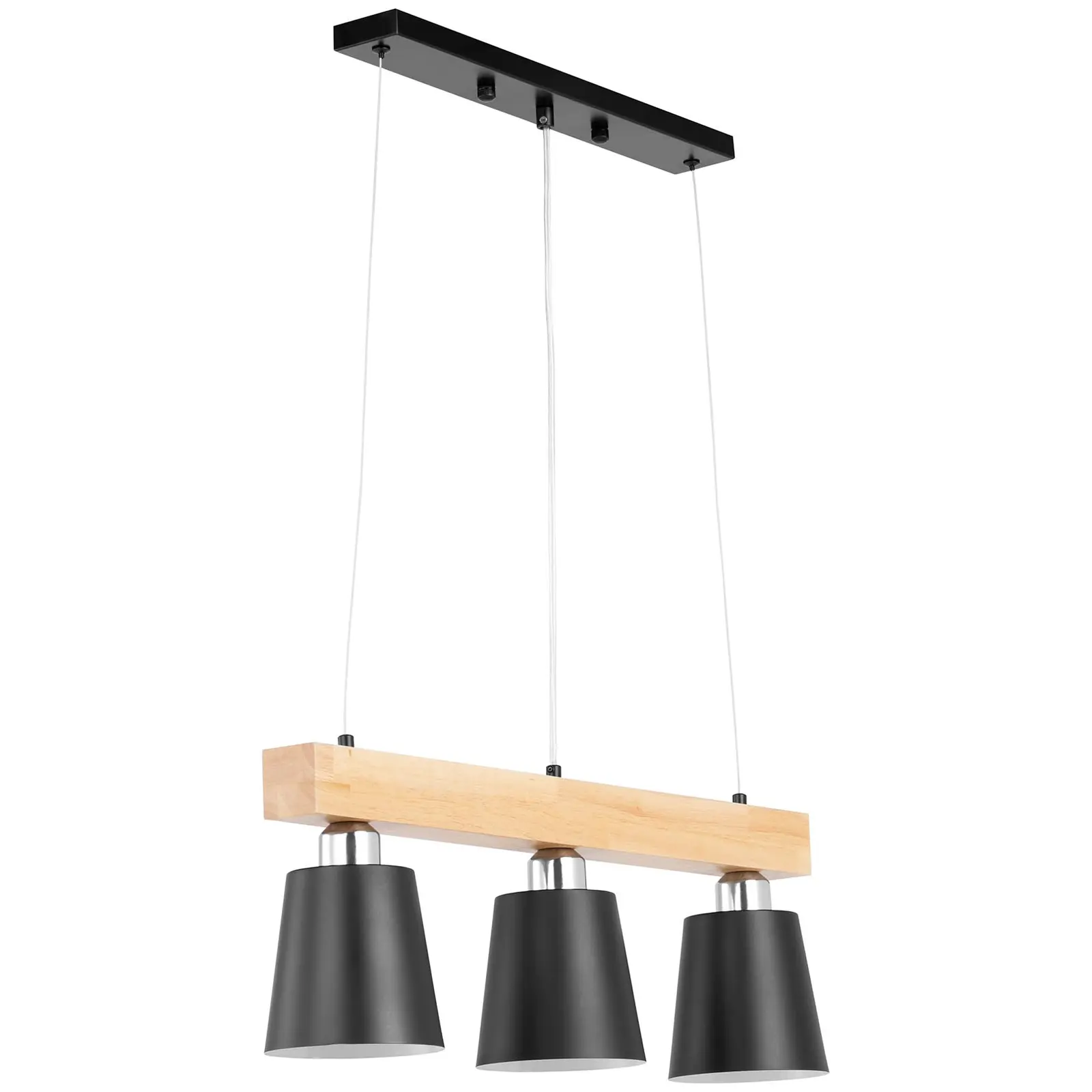 • Elegant - ansamblul format din trei abajururi din fier acoperite cu negru și o grindă subtilă din lemn este mai mult decât o simplă lampă suspendată, este un accent elegant în orice decor.